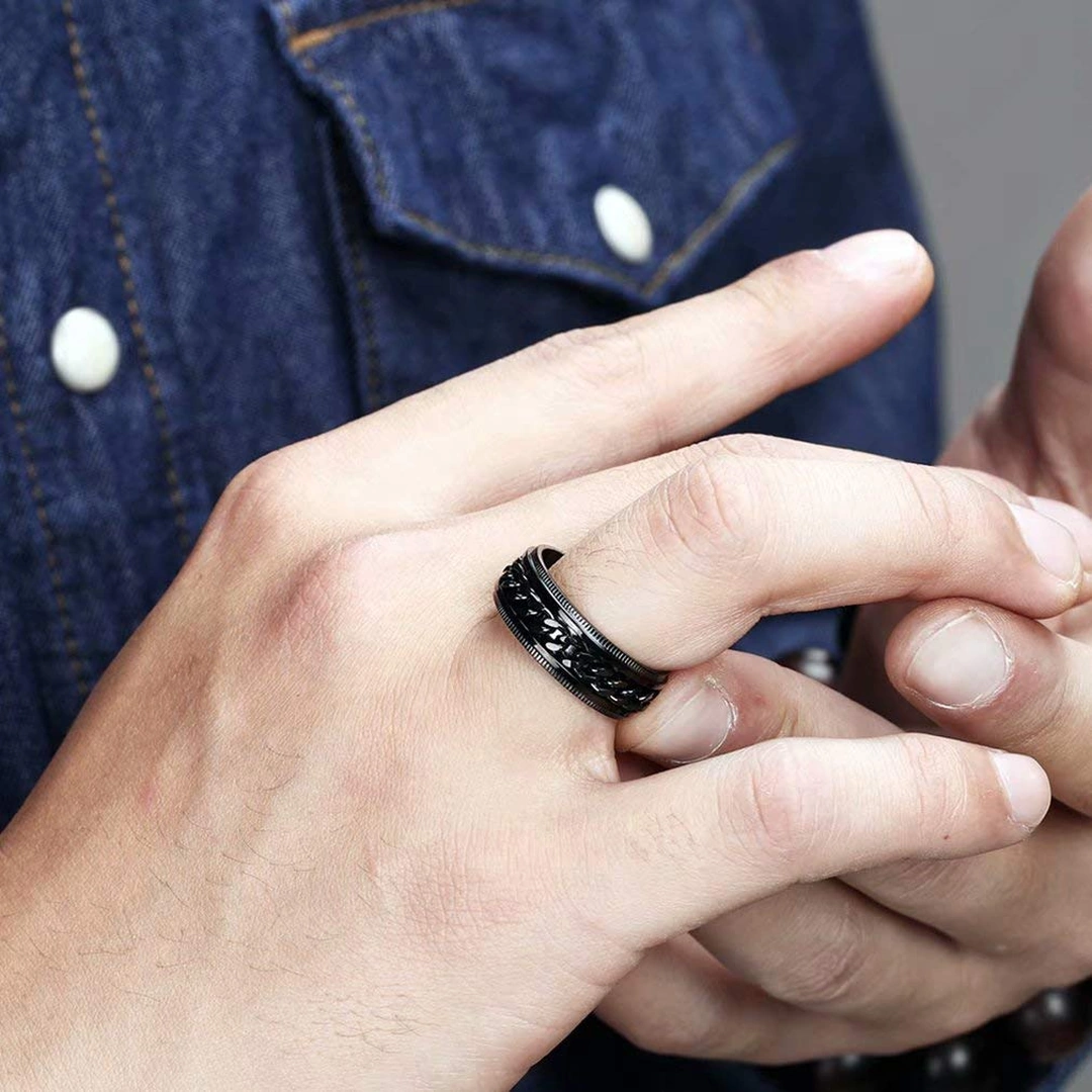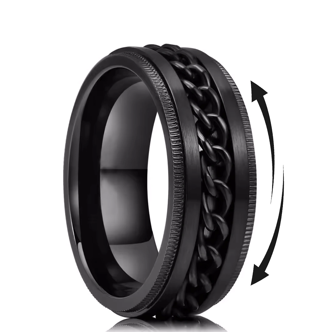 Idéale pour ceux qui aiment les accessoires à la fois sobres et expressifs, cette bague spinner apporte une présence subtile mais affirmée. Sa finition noire intense lui confère un charisme discret, tandis que sa chaîne mobile invite à la réflexion, ou simplement à un instant de détente.