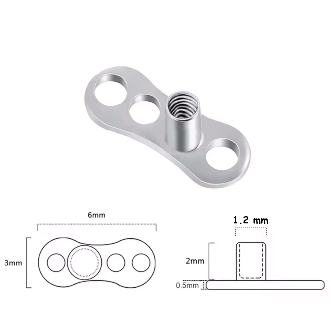 Base microdermale en titane ASTM-F136 à 3 trous. Tige à filetage interne, épaisseur 1.2 ou 1.6 mm. Idéale pour une fixation stable et durable.