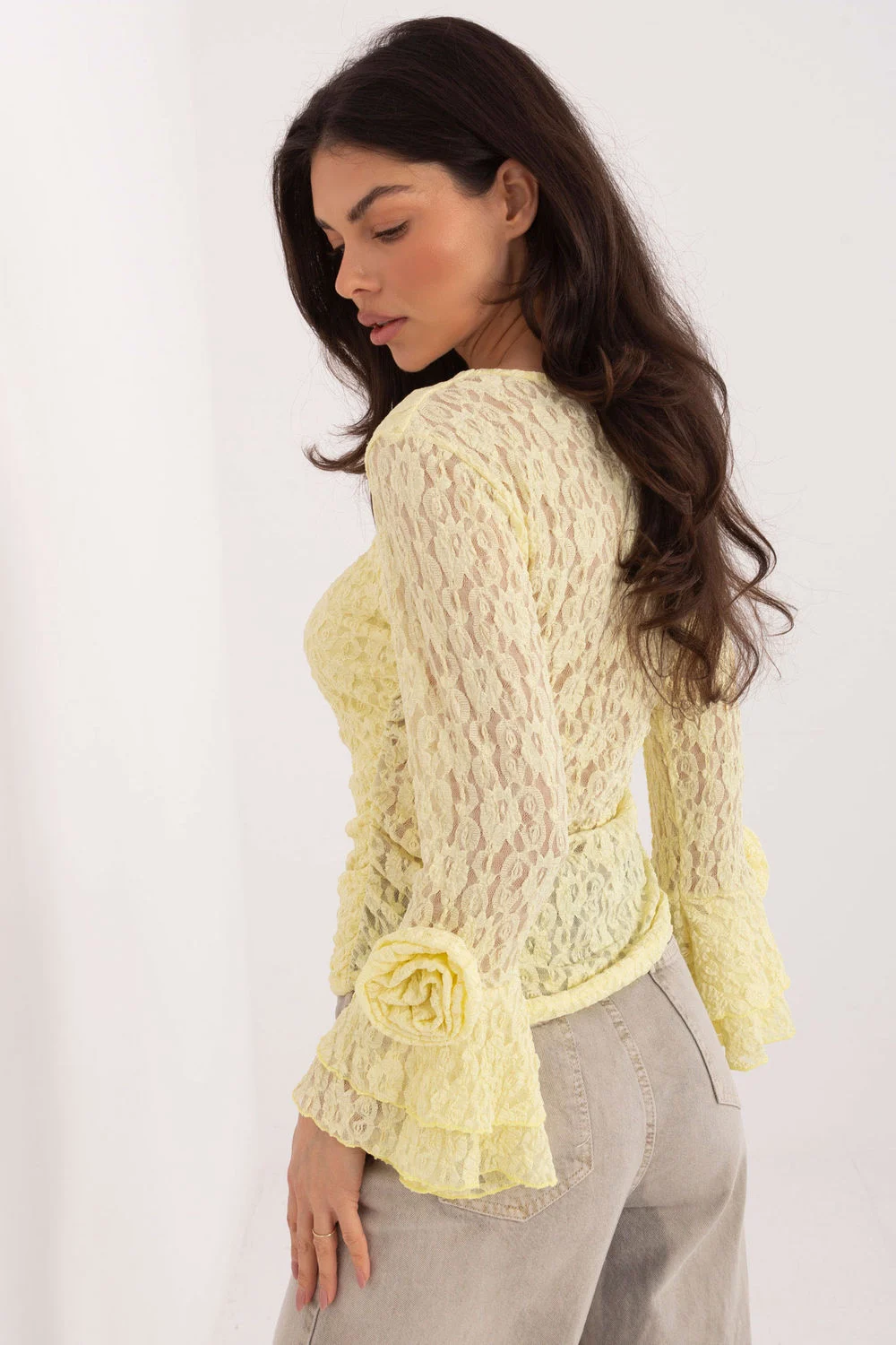 Chemisier en dentelle élégant est une proposition élégante qui se distinguera parfaitement à la fois pour des occasions spéciales et dans des tenues quotidiennes. Fabriqué à partir d’un matériau de haute qualité composé de polyester et d’élasthanne, il assure un confort de port et un bon ajustement à la silhouette. La texture variée du matériau confère à la chemise un caractère unique et une élégance subtile. Le modèle de longueur courte avec un col rond et sans fermeture se présente de manière légère et moderne. Les manches longues de type cloche sont ornées de volants spectaculaires et d’une fleur en tissu décorative, attirant l’attention et ajoutant une touche romantique à l’ensemble. Le devant de la chemise est doublé, tandis que les manches et le dos restent légèrement transparents, mettant en valeur le caractère en dentelle du modèle. Des plis supplémentaires sur les côtés de la chemise modèlent subtilement la silhouette. La chemise conviendra parfaitement en tant qu’élément d’une tenue de soirée, pour une fête, pour le travail et au quotidien, associée à un pantalon taille haute, une jupe ou un jean élégant.