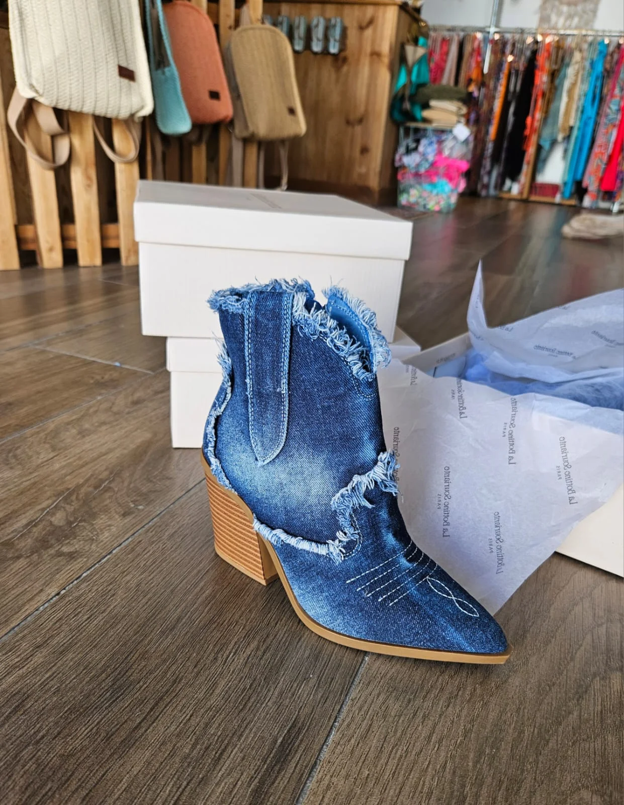 Craquage total pour les boots Santiags en toile de jean denim et délavé. Tige basse, elles s’enfilent facilement et vous donnent de l’aisance. Confortables à souhait! La santiag revient en force et pour être fashion, portez là à toutes les saisons! Sa coupe western nous donne un air d’été avant l’heure! Talon en léger bizot: 8cms.