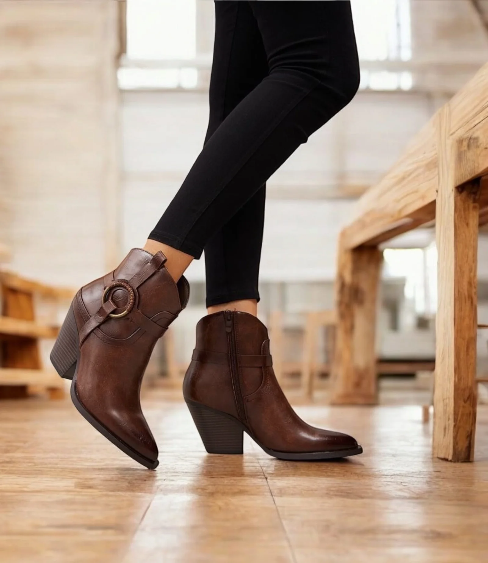 Craquage total pour les bottines avec boucle couleur chocolat. Tige basse, elles s’enfilent facilement et vous donnent de l’aisance. Confortables à souhait (légèrement fourrées à l’intèrieur)! La bottine un brin cow boy revient en force et pour être fashion, portez la à toutes les sauces! Sa coupe western nous fait craquer! Jeans ou robe, elles font l’affaire ! Talon en léger bizot: 8cms.