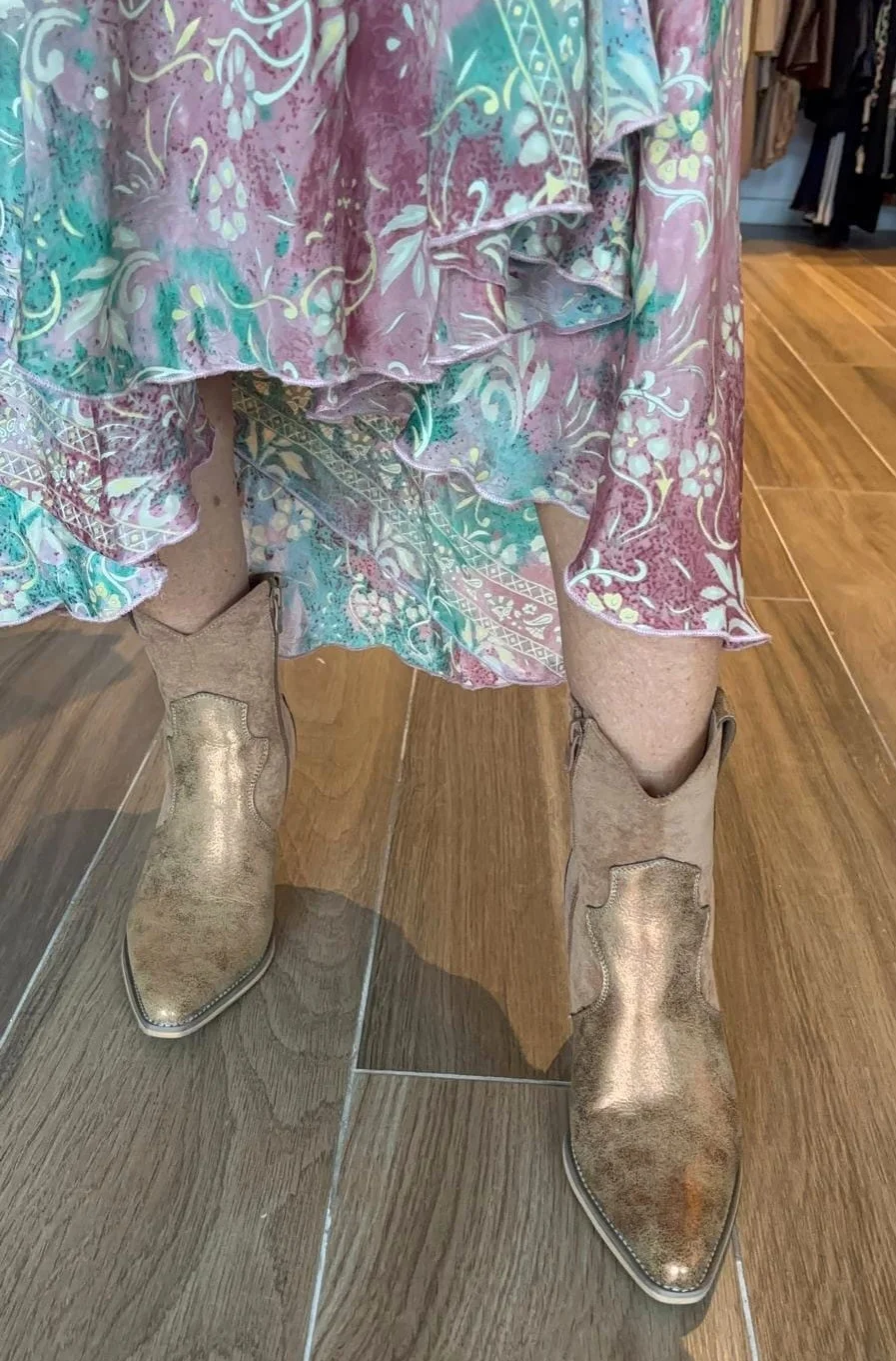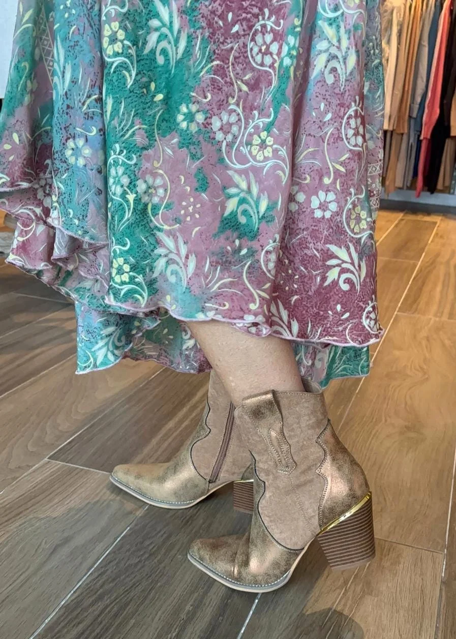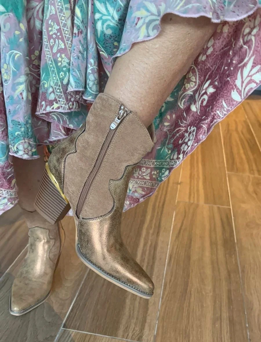 Craquage total pour les bottines couleur camel irisé. On aime son effet vieilli et son mélange de matières. Tige basse, elles s’enfilent facilement grâce à son zip interieur et vous donnent de l’aisance. Souples et confort à souhait…la bottine et son look western revient en force et pour être fashion, portez la à toutes les sauces! Sa coupe cow boy nous fait craquer! Jeans ou robe, elles font l’affaire ! Talon en léger bizot: 8cms.