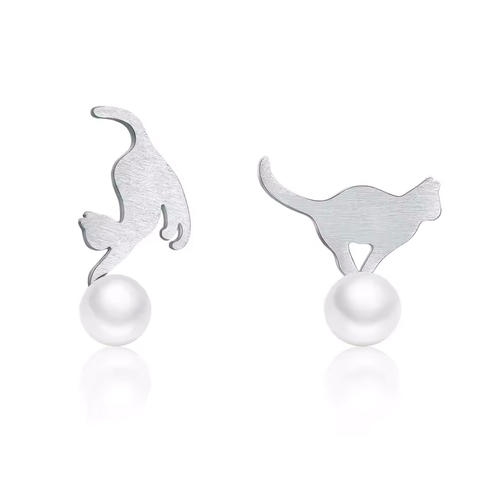 Boucles d’Oreilles Chat en Argent Jouant avec une Perle Fantaisie