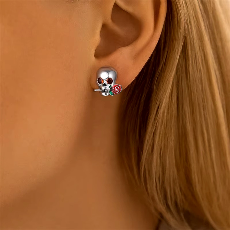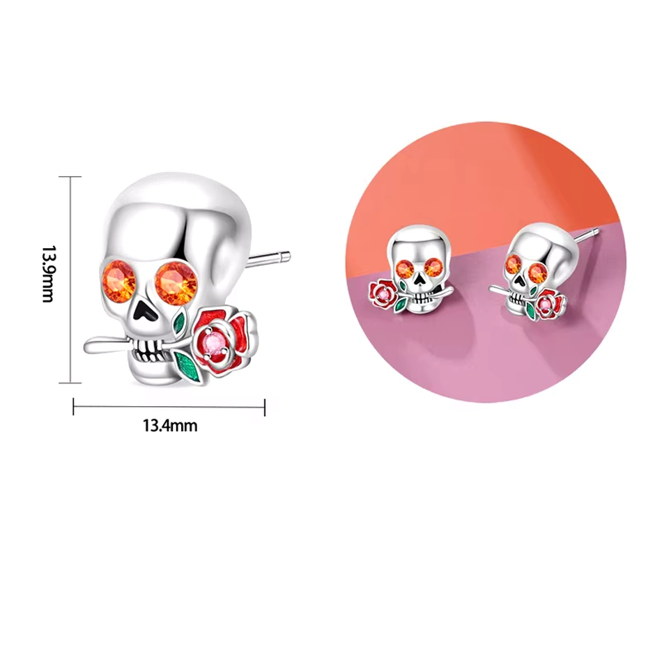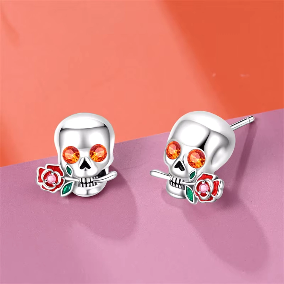 Affirme ton style avec ces boucles d’oreilles en argent 925 sterling : une tête de mort aux yeux orange étincelants, tenant une rose, pour une touche audacieuse et élégante. Vendues par paire