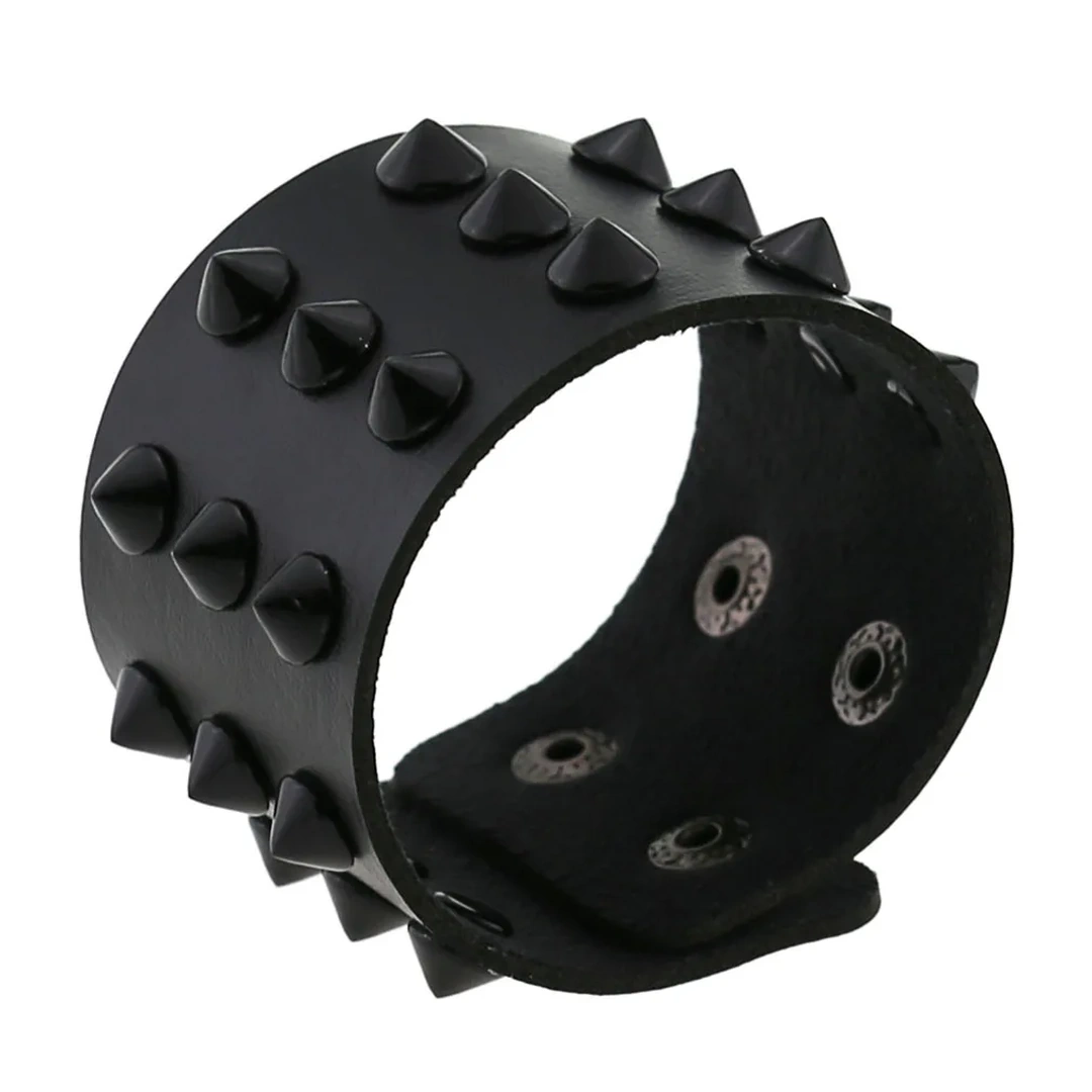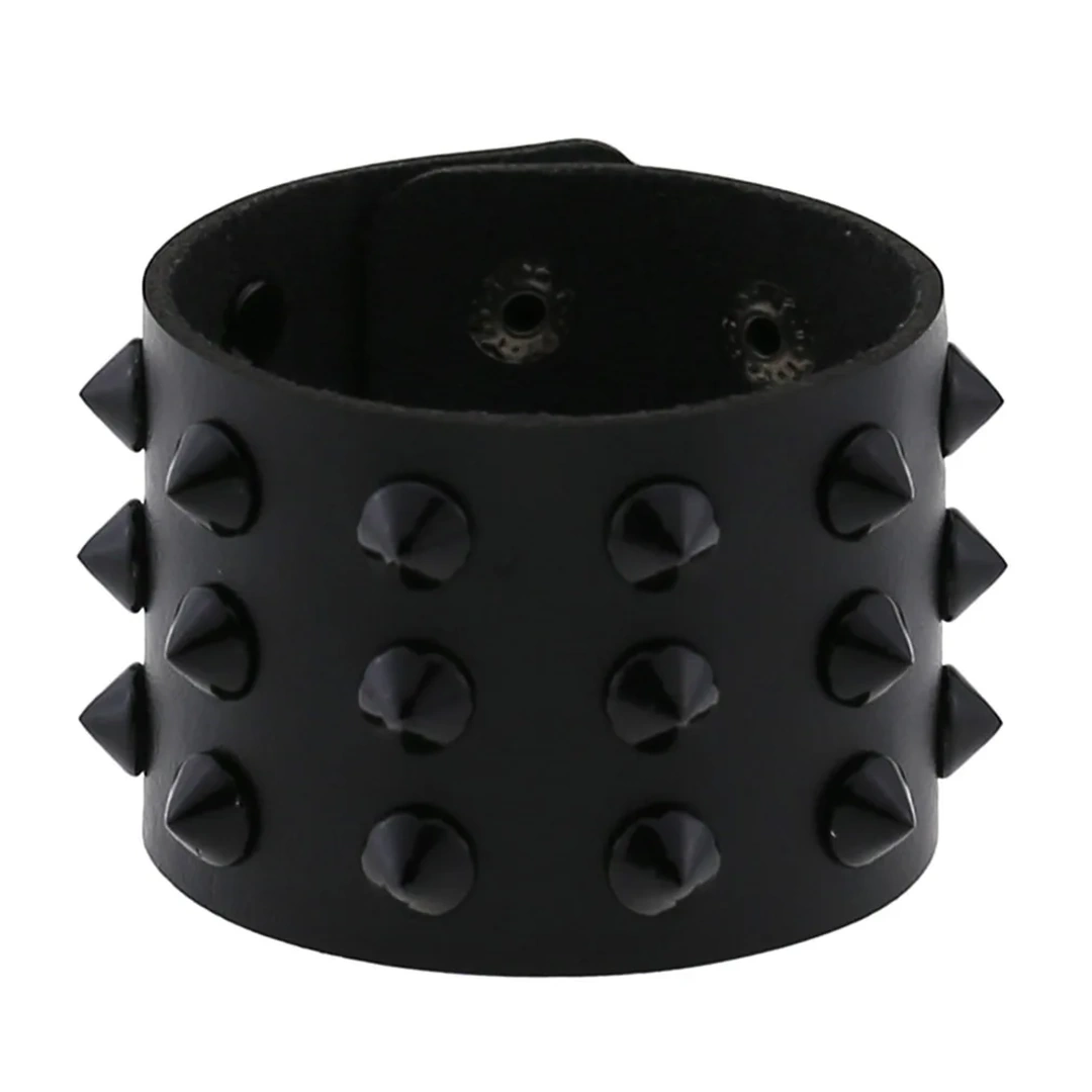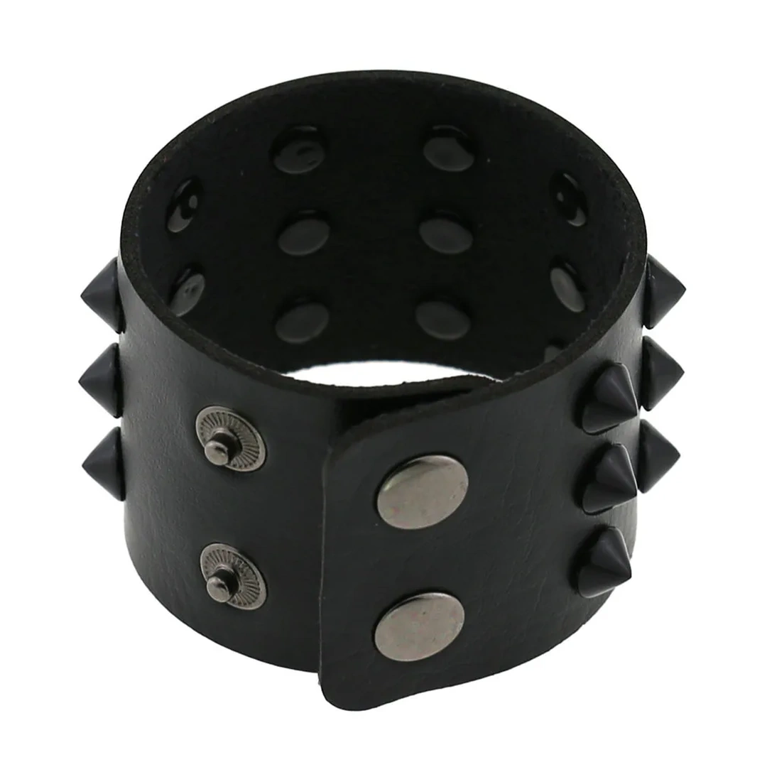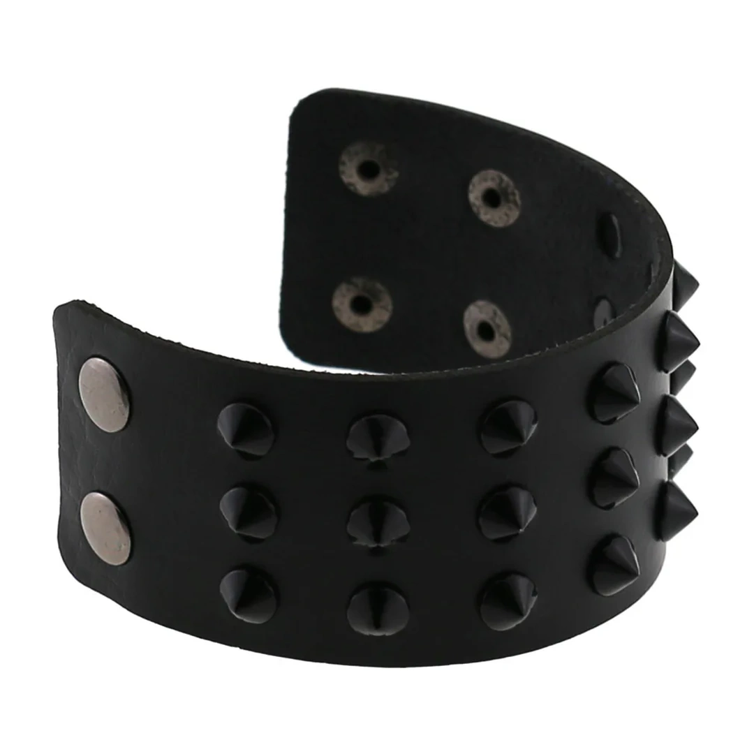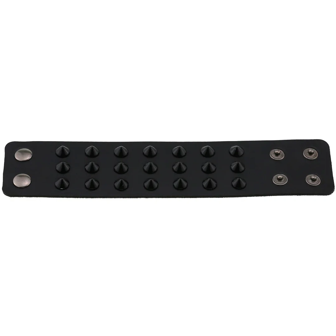 Noir ou violet profond, ce bracelet en cuir PU impose son style sans détour. Trois rangées de clous coniques noirs, courts et parfaitement alignés, marquent la surface avec précision.
