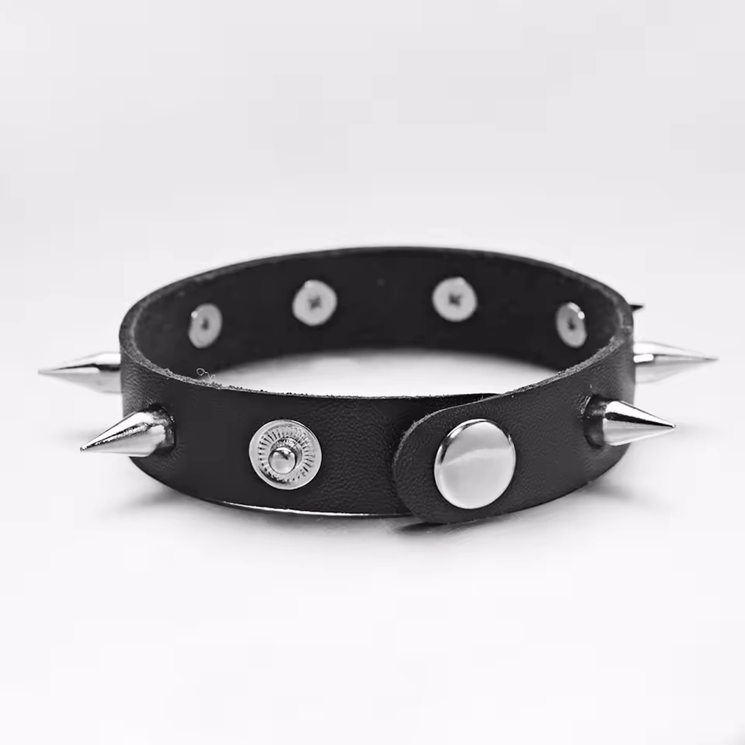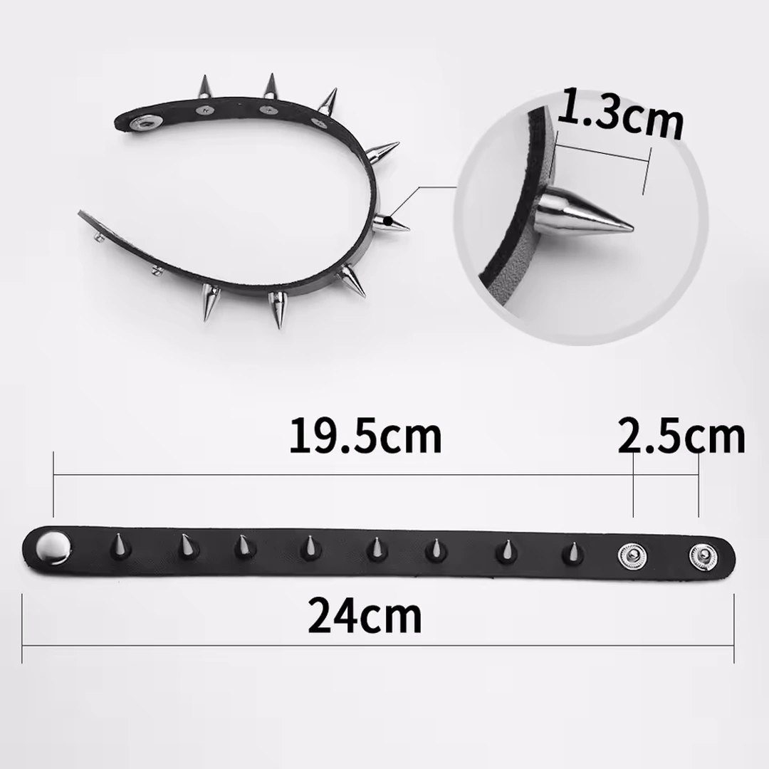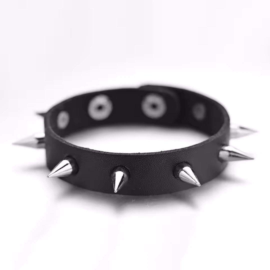 Fabriqué en similicuir noir souple, il s’enroule avec aisance autour du poignet, tandis que huit longues pointes en métal argenté (1,3 cm chacune) viennent ponctuer la surface, comme un rappel assumé des codes underground.