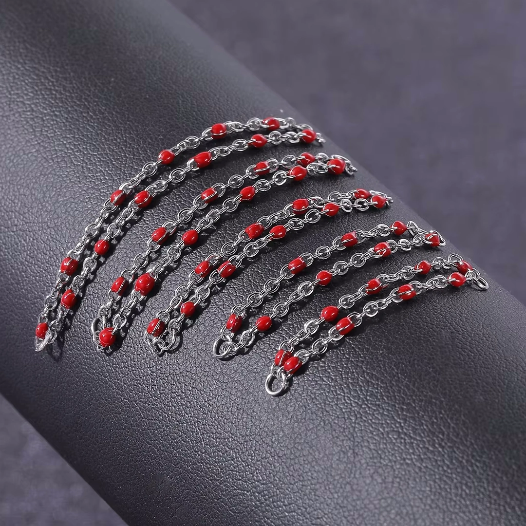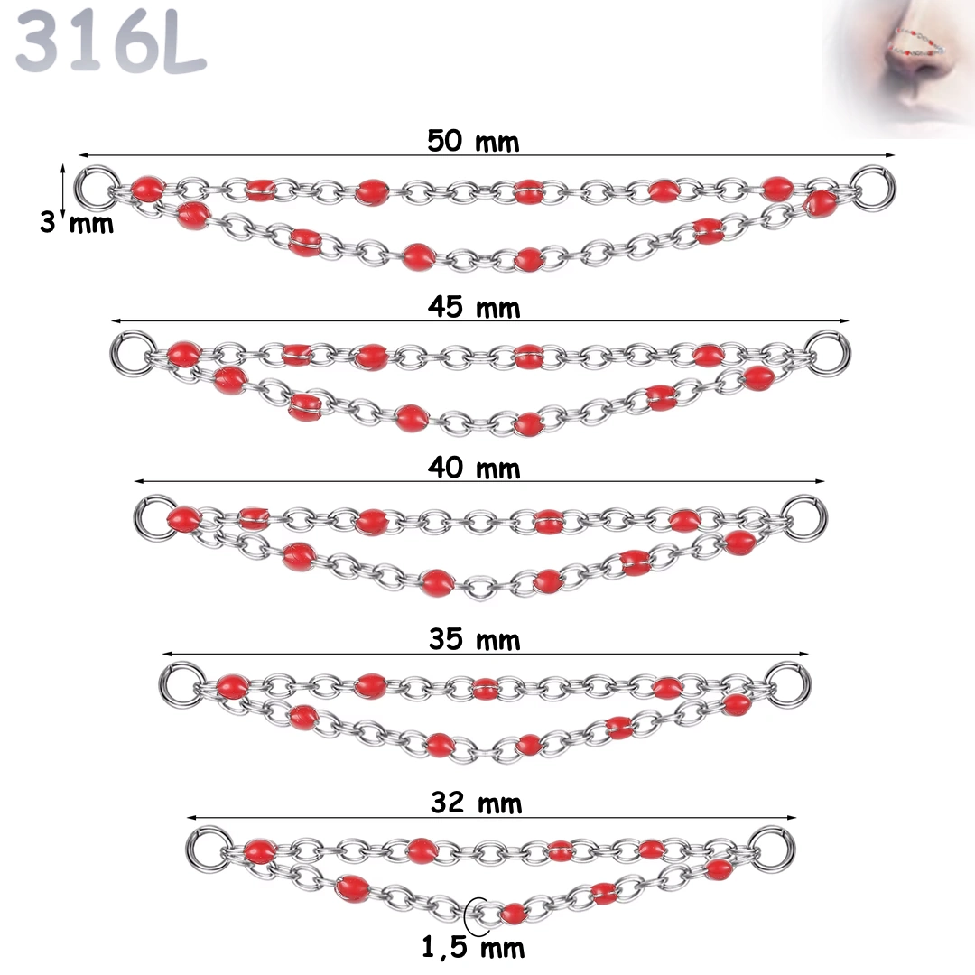 Chaîne de nez double nostril 316L avec double rangée perlée rouge. Longueur 32 à 50 mm pour un ajustement parfait et un style unique.