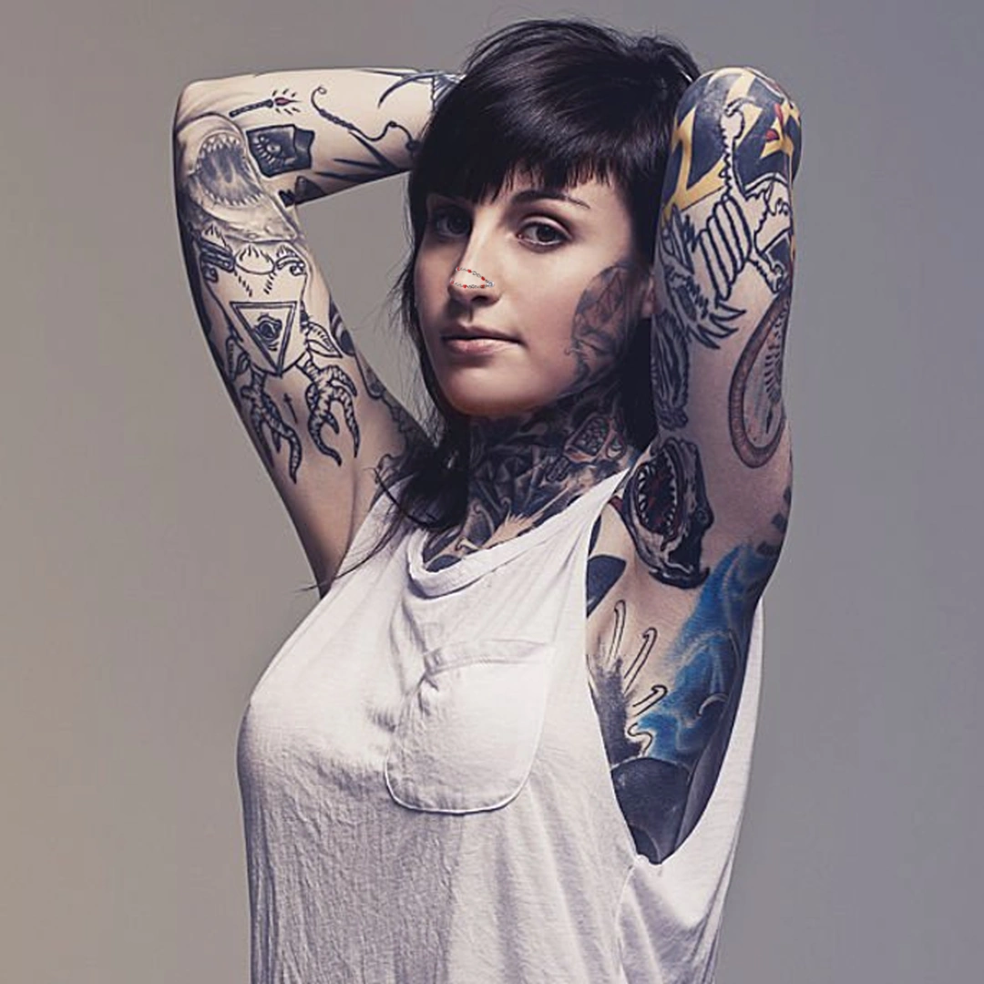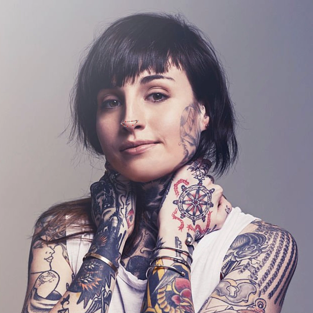 Les petites perles rouges – vibrantes, lumineuses, soigneusement réparties – ajoutent une touche d’énergie et de contraste. Elles capturent la lumière, dynamisent le visage et mettent instantanément en valeur le double nostril.