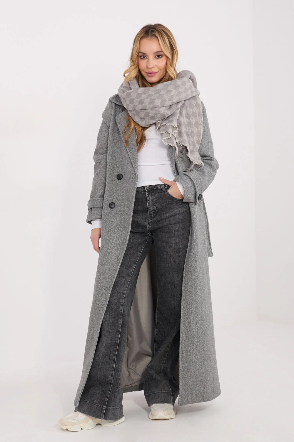 L’écharpe fabriquée à partir d’un mélange de haute qualité de viscose et de laine séduit par sa structure agréable au toucher et sa finition élégante. Son motif géométrique dominant donne à l’ensemble un caractère moderne. Le modèle a des dimensions impressionnantes de 148 × 148 cm, ce qui permet de le porter de différentes manières, […]