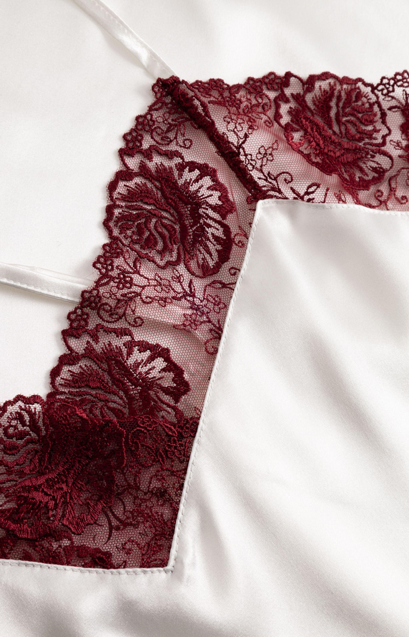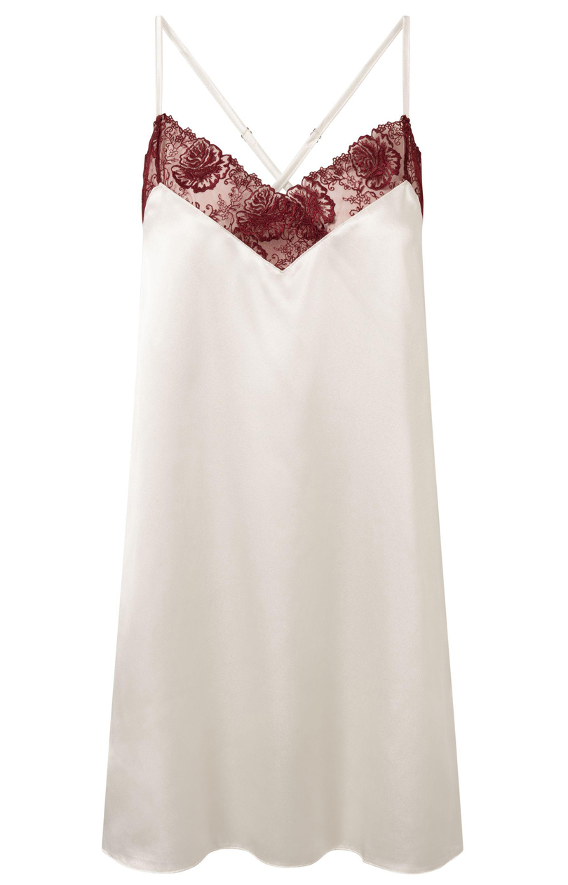 Élégante nuisette en satin à la coupe simple et classique. La nuisette est dotée de fines bretelles réglables et d’un décolleté en dentelle décorative.