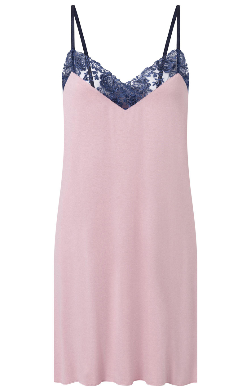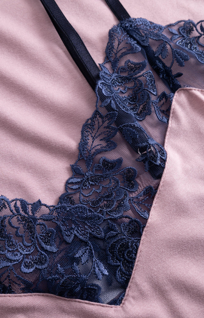 Chemise de nuit à la coupe ample et confortable, avec fines bretelles réglables. Encolure pointue ornée de dentelle de couleur contrastée.