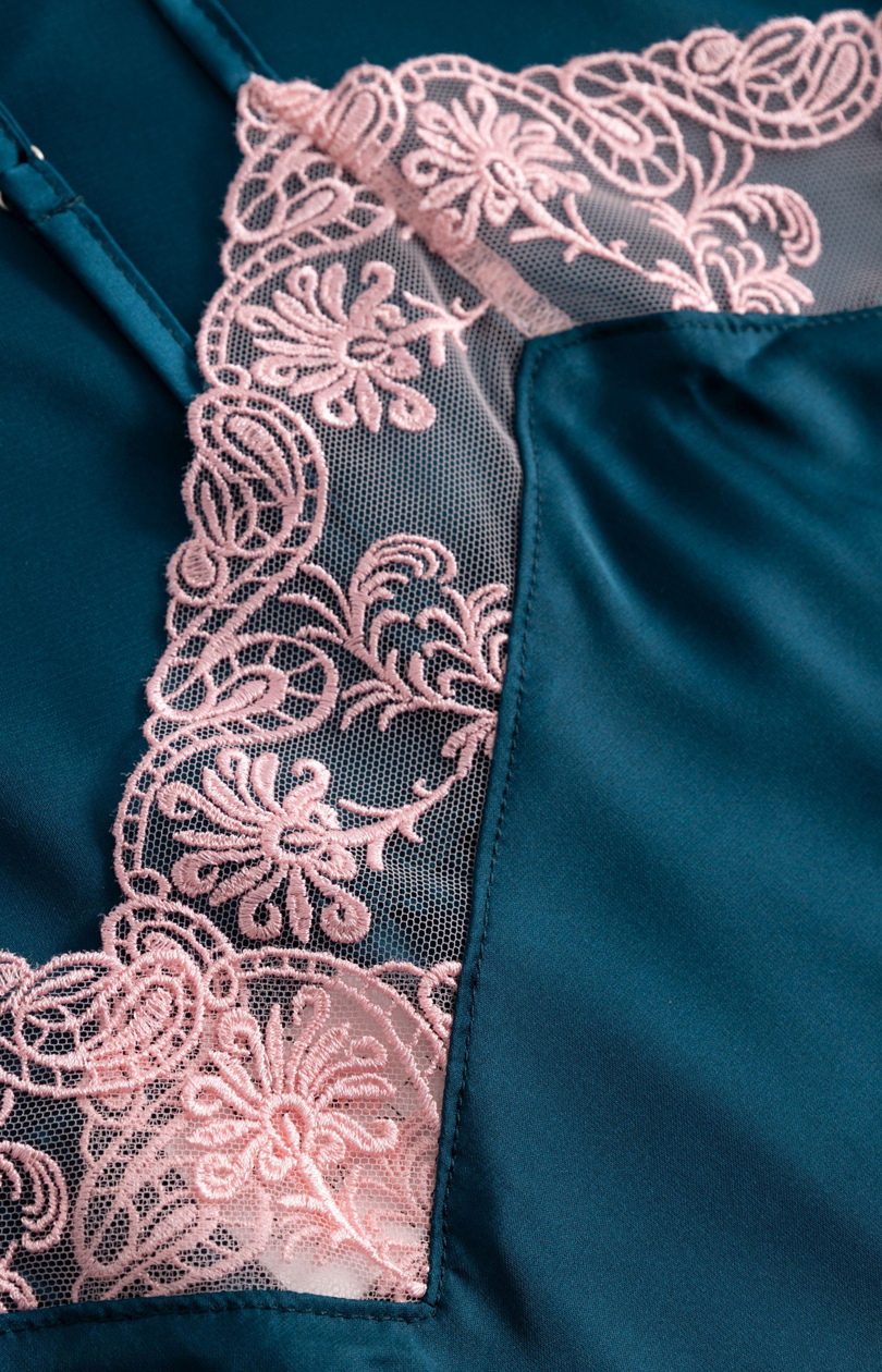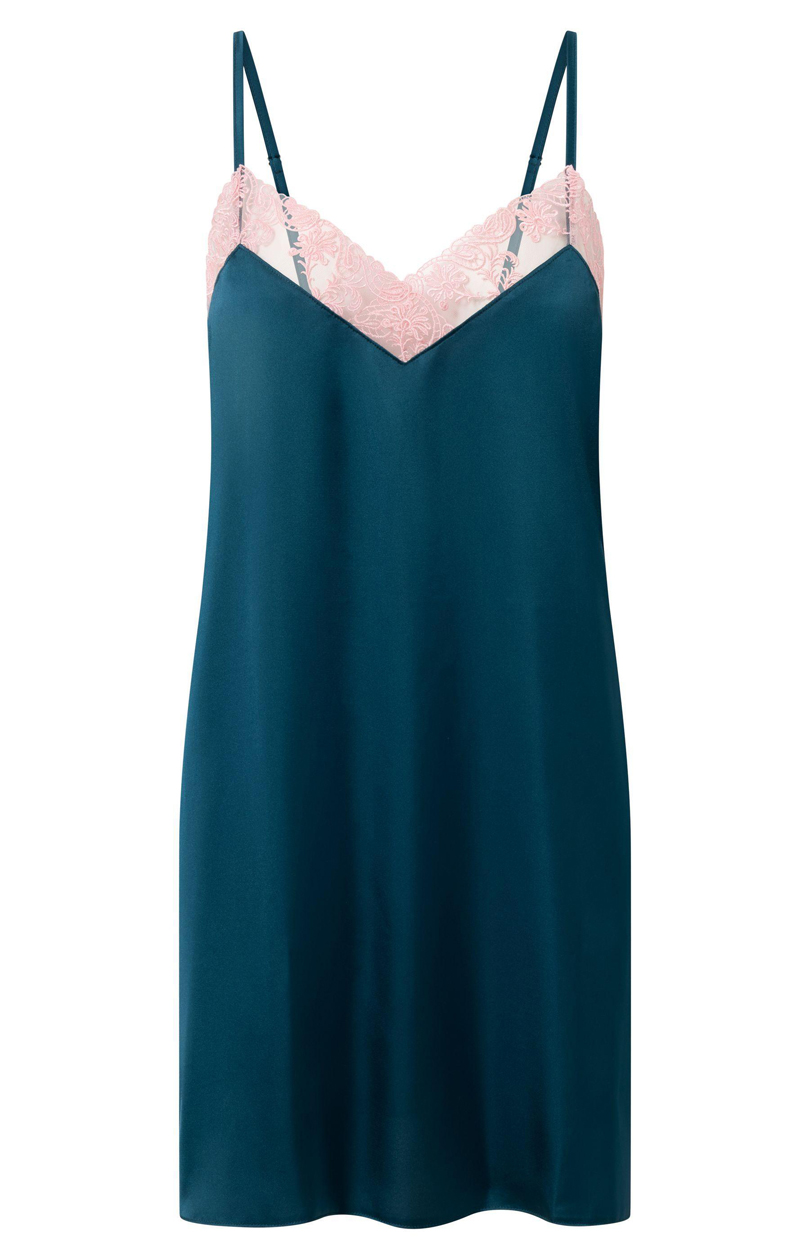 Chemise de nuit à la coupe ample et confortable, avec fines bretelles réglables. Encolure pointue ornée de dentelle de couleur contrastée.