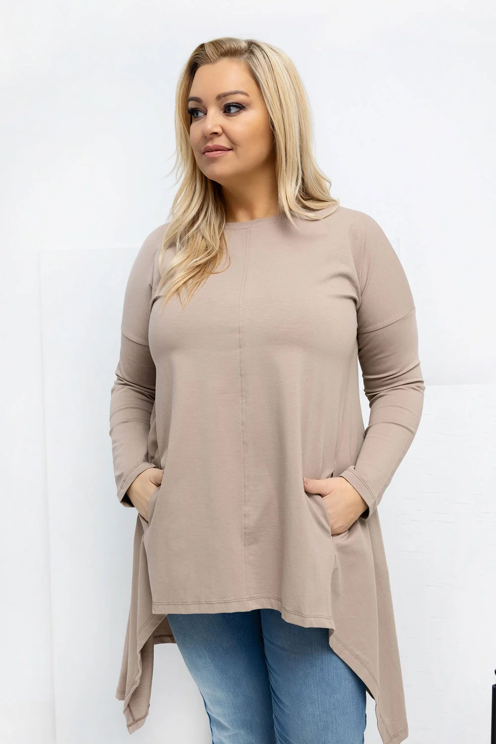 Chemise asymétrique grande taille dans un style décontracté est une proposition idéale pour tous les jours, alliant confort et allure à la mode. Le modèle avec un devant plus court et un dos plus long affine subtilement la silhouette tout en offrant une liberté de mouvement. Sa coupe lisse la rend polyvalente et facile à styliser, elle se mariera parfaitement avec un jean ou des leggings. Fabriquée en coton de haute qualité avec une touche d’élasthanne, elle est douce, respirante et élastique, s’adaptant parfaitement à la silhouette. Les manches longues et l’encolure ronde classique soulignent son caractère quotidien. Les poches dissimulées dans les coutures latérales sont un atout pratique qui ajoute une touche de modernité. Sans fermeture, cette chemise offre un confort accru et met en valeur son style décontracté et détendu.
