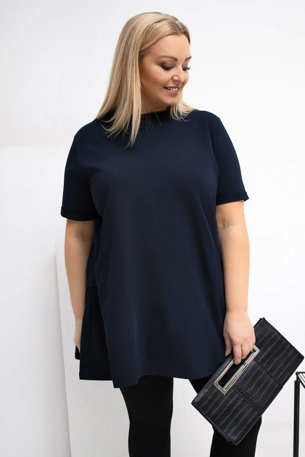La tunique allongée de style décontracté, parfaite pour les occasions quotidiennes. Fabriquée dans un coton agréable au toucher avec une touche d’élasthanne, elle est douce, extensible et confortable à porter toute la journée. Son motif lisse lui permet de s’adapter facilement à de nombreuses tenues. Le modèle présente un col rond et des manches courtes, lui donnant un caractère universel et décontracté. L’absence de fermeture souligne sa forme simple et confortable. Un volant à l’ourlet à l’arrière est un atout supplémentaire, apportant subtilement de la vivacité au style et lui donnant un charme féminin. Une proposition idéale pour tous les jours avec un jean, un legging ou une jupe.