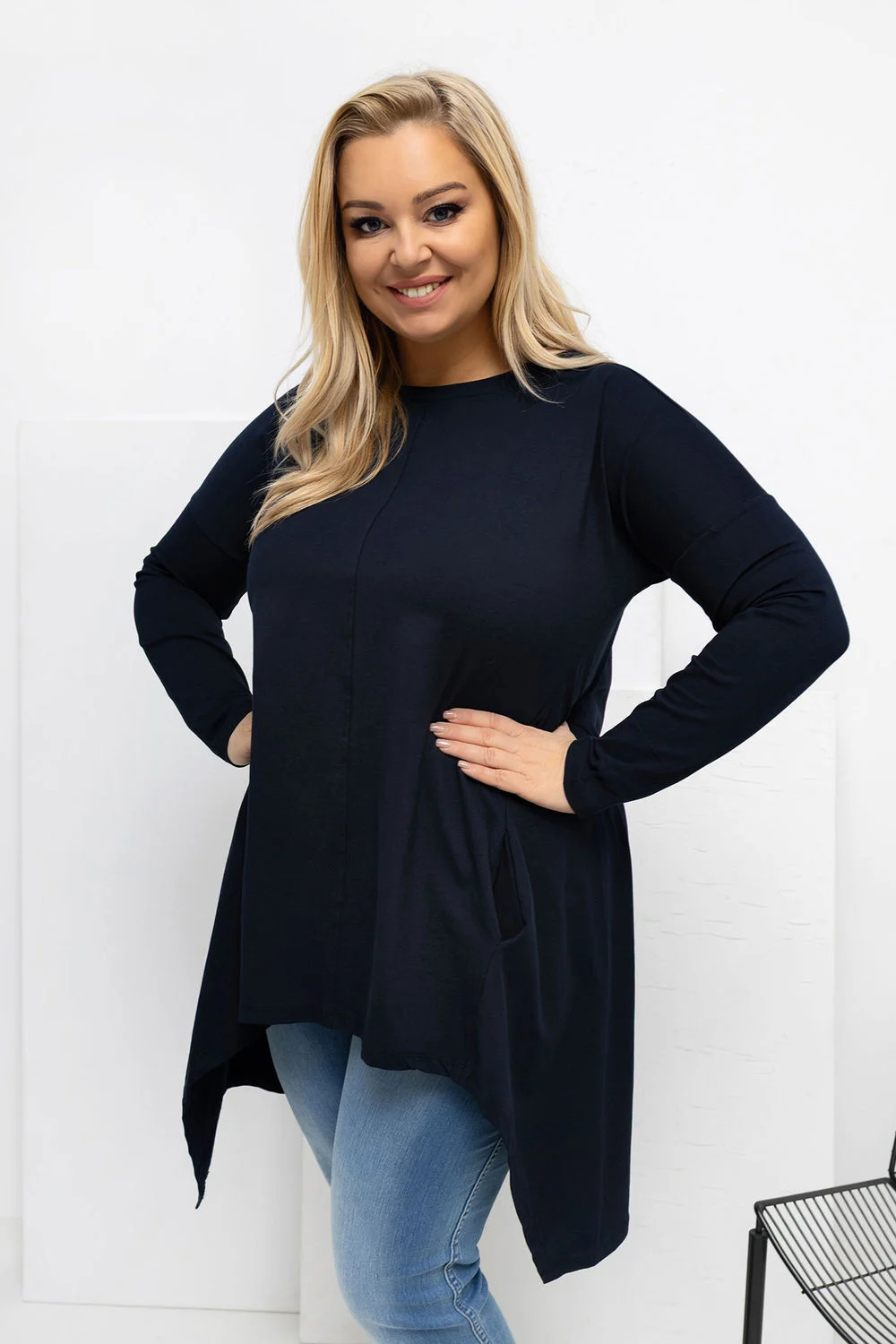 T-shirt asymétrique grande taille dans un style décontracté est une proposition idéale pour tous les jours, alliant confort et look tendance. Le modèle avec un devant plus court et un dos plus long affine subtilement la silhouette et assure une liberté de mouvement. La coupe lisse rend le t-shirt polyvalent et facile à styliser, il se marie parfaitement aussi bien avec un jean qu’avec des leggings. Fabriqué en coton de haute qualité avec une touche d’élasthanne, il est doux, respirant et élastique, s’adaptant parfaitement à la silhouette. Les manches longues et l’encolure classique ronde soulignent son caractère quotidien. Les poches dissimulées dans les coutures latérales sont un atout pratique qui ajoute fonctionnalité et une touche moderne. Le t-shirt n’a pas de fermeture, ce qui augmente le confort de port et souligne son style décontracté et décontracté.