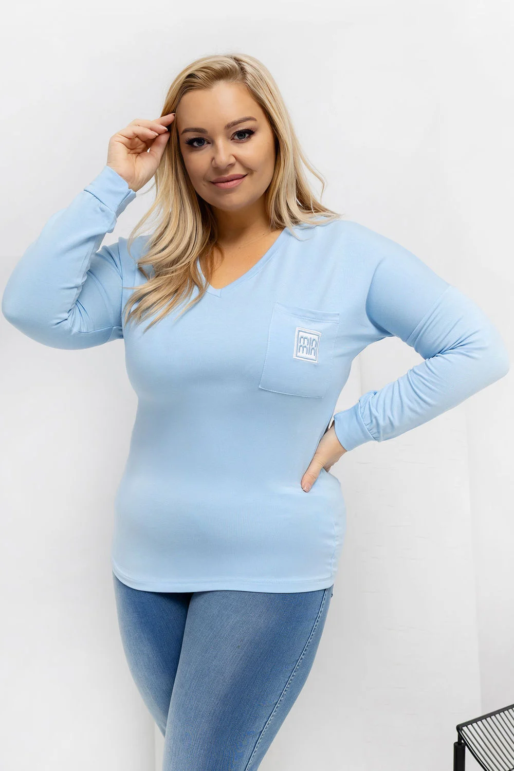 Chemisier grande taille au caractère classique et quotidien est une excellente base pour de nombreuses tenues. Le motif lisse lui confère une polyvalence, ce qui permet de l’associer facilement aussi bien à un jean qu’à un pantalon en tissu ou des leggings. Sa longueur standard lui permet de bien se poser sur la silhouette et assure un confort toute la journée. Ce modèle est fabriqué dans un micro modal exceptionnellement doux avec une touche d’élasthanne, agréable au toucher, respirant et flexible. Les manches longues et le décolleté en V soulignent subtilement le cou et le décolleté, ajoutant de la légèreté à l’ensemble. Le chemisier n’a pas de fermeture, ce qui augmente le confort d’utilisation. L’accent stylé est la poche à hauteur de la poitrine ornée d’un patch décoratif, qui brise la forme simple et confère au chemisier un caractère moderne.