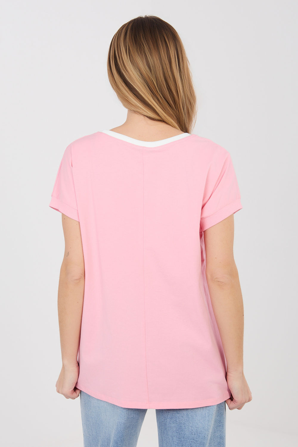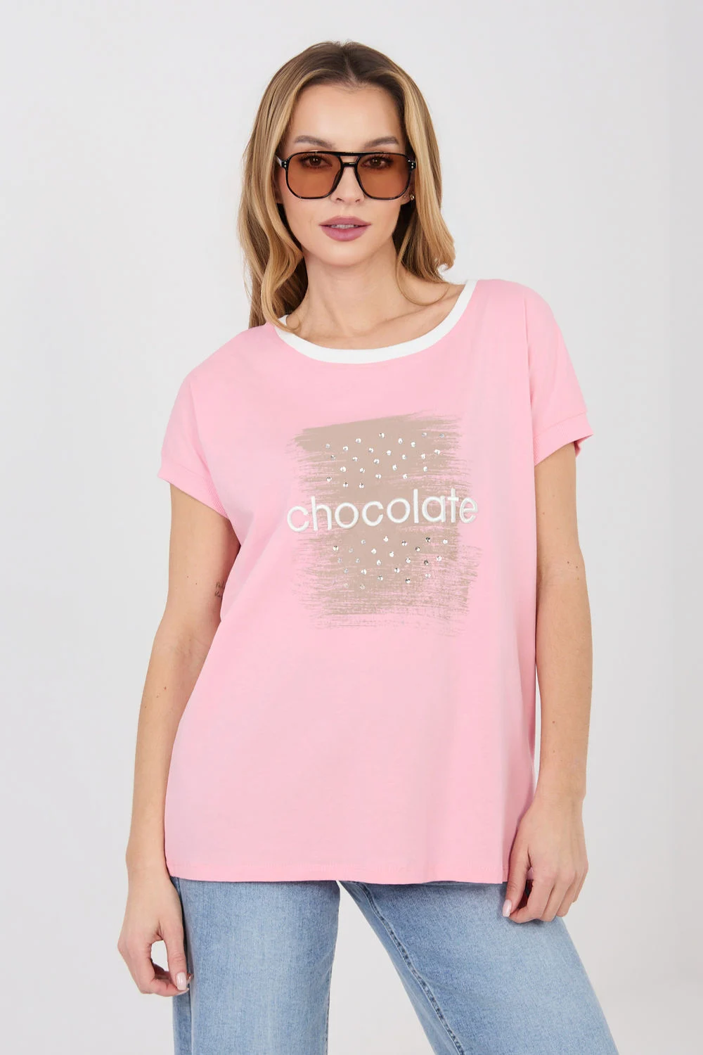 Élégant et confortable chemisier de tous les jours dans une version décontractée, idéal pour tous les jours. Le modèle a un col rond classique bordé d’une garniture contrastante, ce qui lui donne un caractère subtil et met en valeur les détails de la tenue. Le chemisier est orné d’une inscription brodée avec des paillettes sur le devant, constituant un accent spectaculaire et un motif dominant de l’ensemble du modèle. Le manche courte et la longueur standard assurent un confort de port, et la coupe ample et décontractée s’inscrit dans un style décontracté. Fabriqué en coton de haute qualité avec une touche d’élasthanne, il est doux, agréable au toucher et légèrement élastique, garantissant un confort toute la journée. Le modèle n’a pas de fermeture éclair, ce qui souligne la simplicité et la fonctionnalité du design.
