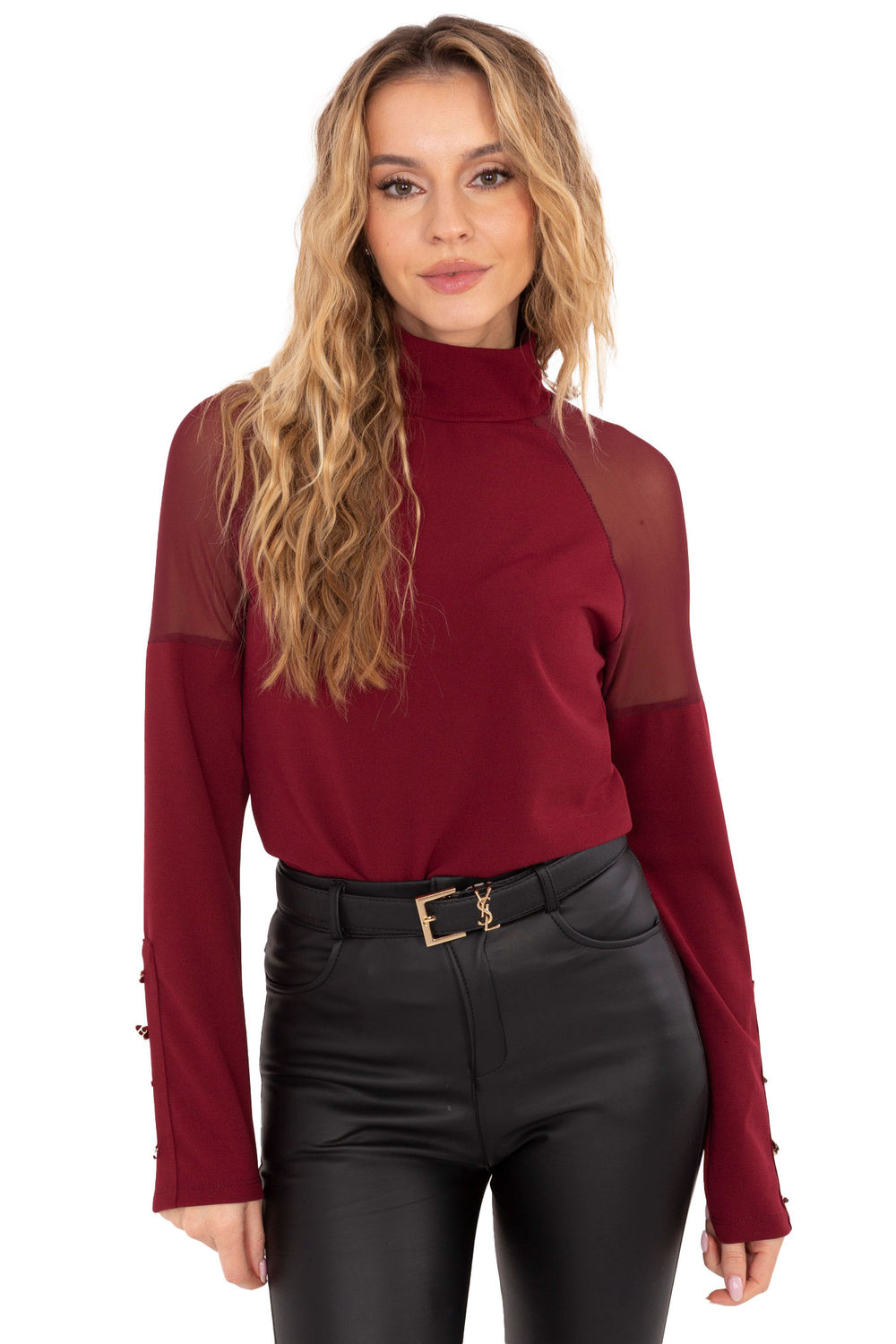 Un chemisier élégant à la finition lisse est un choix stylé idéal pour tous les jours, pour le travail et pour les occasions spéciales. Fabriqué à partir d’un mélange de polyester, viscose et élasthanne de haute qualité, il assure un confort de port et un ajustement parfait. Le modèle se distingue par des inserts subtils en résille sur les épaules, qui ajoutent une touche moderne et féminine à l’ensemble. Le chemisier a une longueur standard, des manches longues et un col roulé classique qui souligne le style élégant. Les boutons décoratifs sur les manches constituent un détail élégant, donnant au modèle une expression unique. Sans fermeture, le chemisier est confortable et facile à enfiler. C’est une proposition intemporelle pour les femmes qui apprécient l’élégance, le confort et les accents subtils dans leurs tenues quotidiennes et plus formelles.