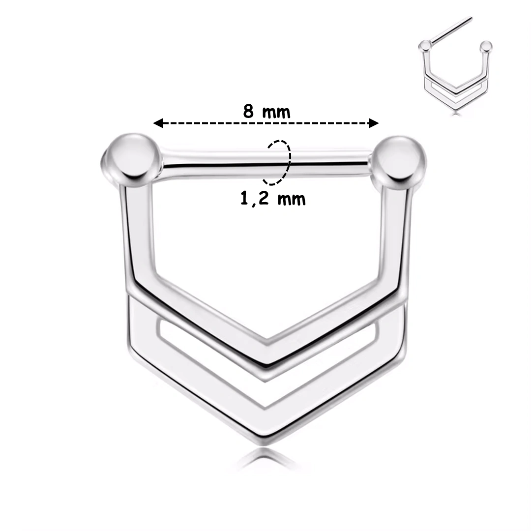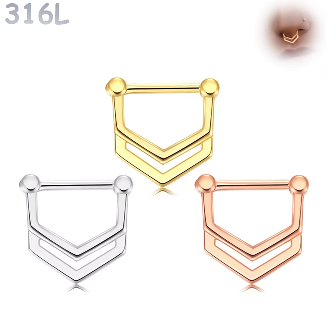 Clicker septum en acier 316L, design double flèche. Charnière 8 mm, épaisseur 1,2 mm. Élégance géométrique en argenté, doré ou or rose.