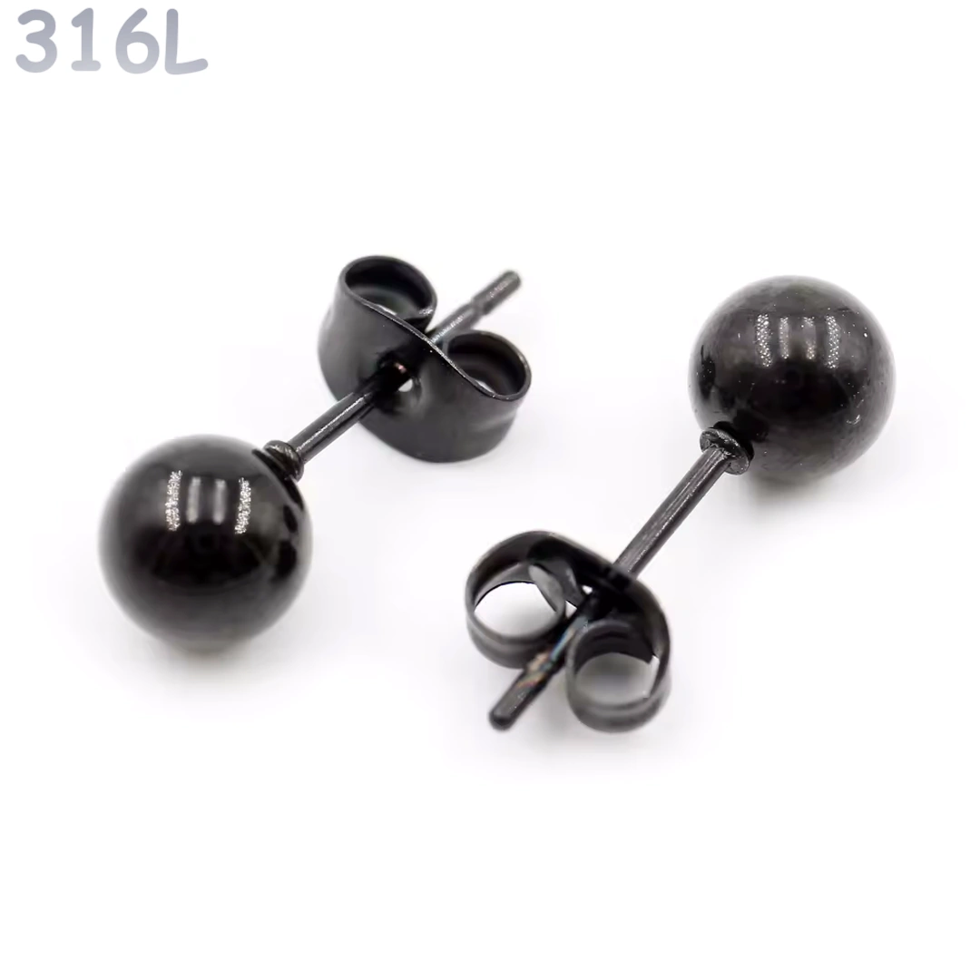 Clous d’oreilles boule en acier 316L, diamètre 2 à 8 mm, finition acier poli ou noir PVD. Minimalistes, résistants, parfaits en accumulation.