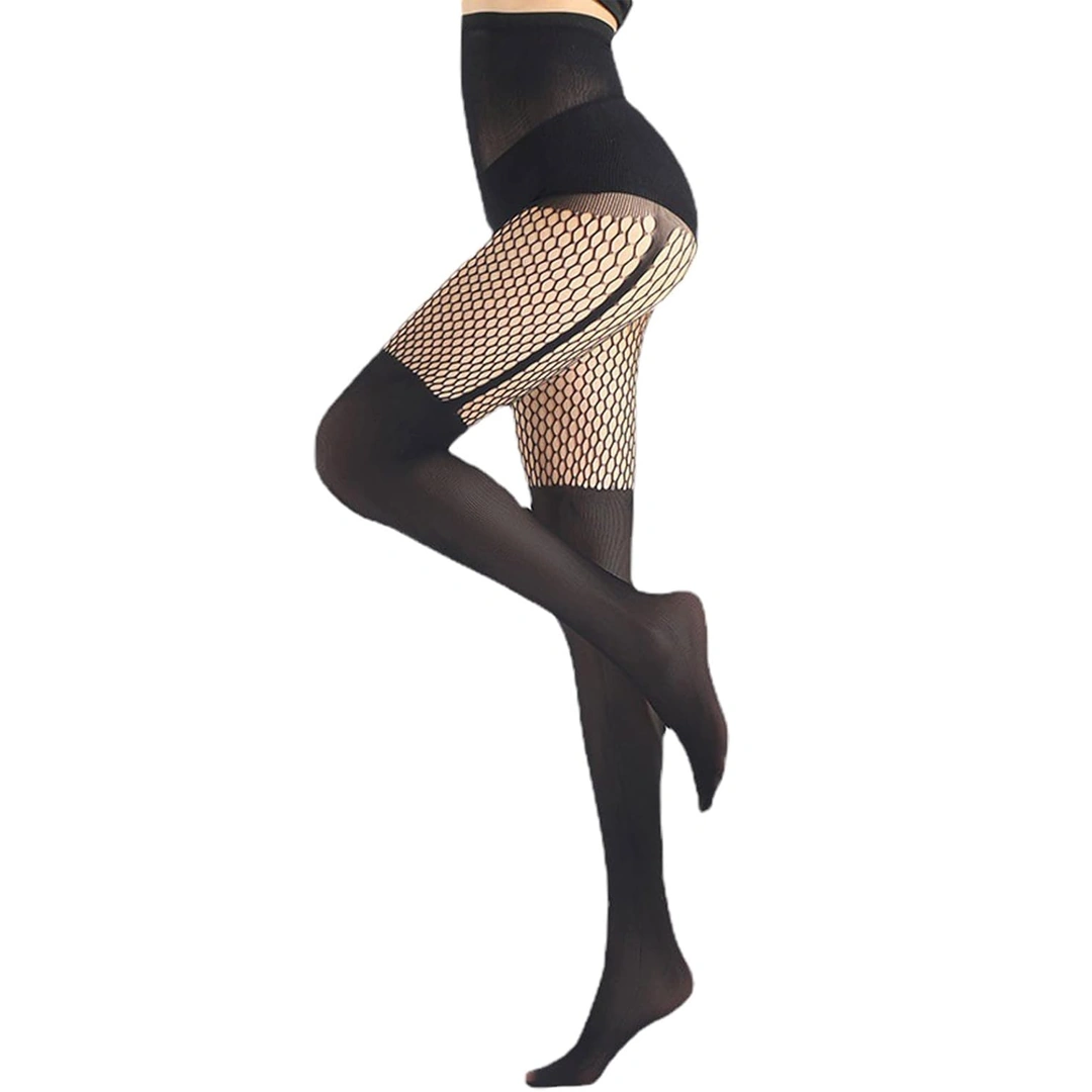La maille résille se dessine en “stockings” sur le haut des cuisses, reliée par des bandes verticales façon jarretelle qui allongent visuellement la jambe. En dessous, une résille plus fine prend le relais pour un rendu uniforme et élégant.