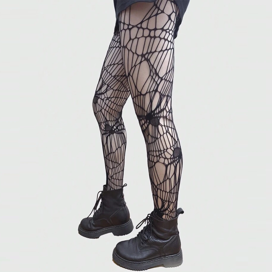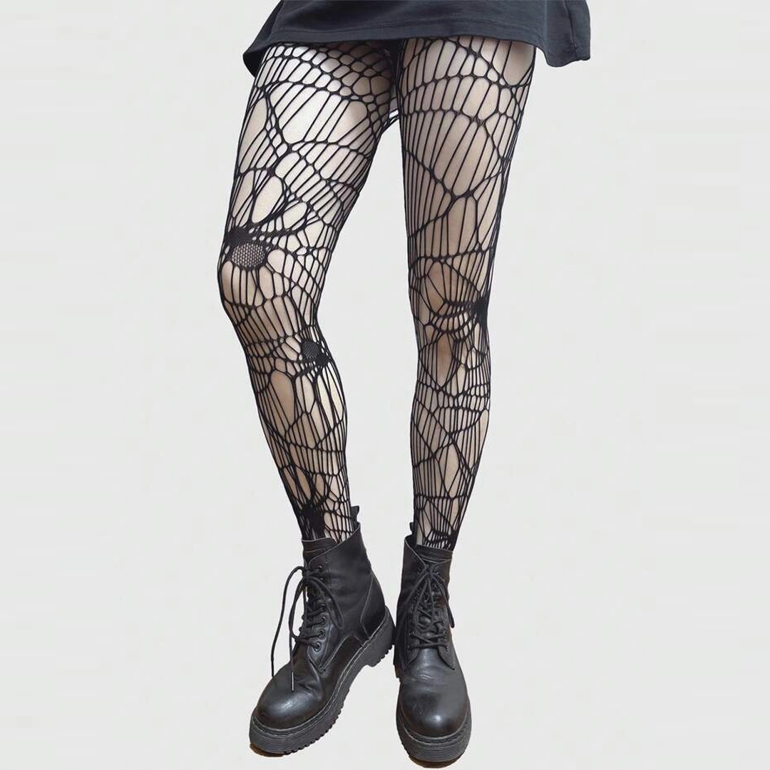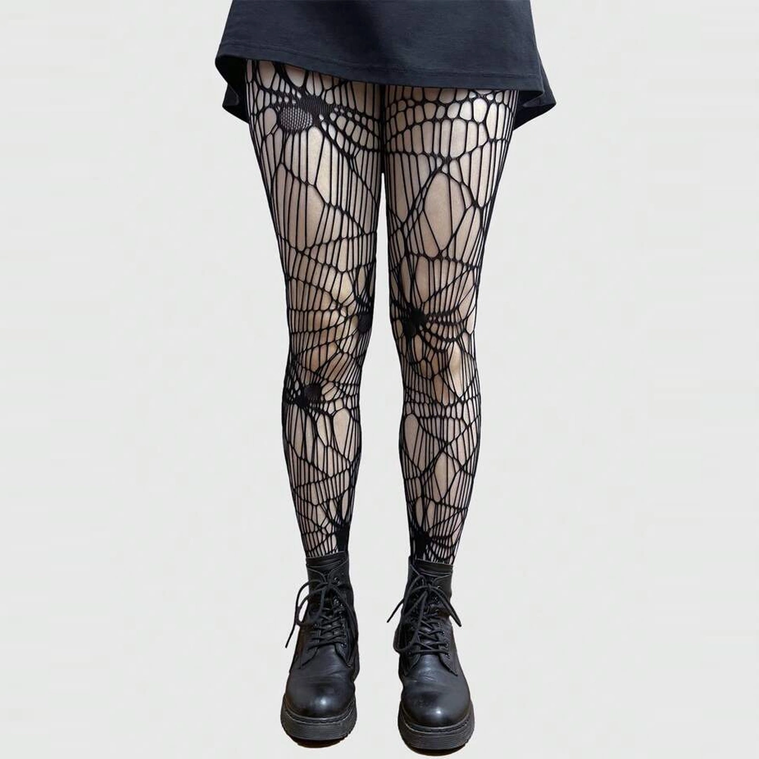 Collants noirs à motif toile d’araignée. Résille asymétrique, araignées élégantes et allure gothique assumée. Taille haute et unique 36–42.