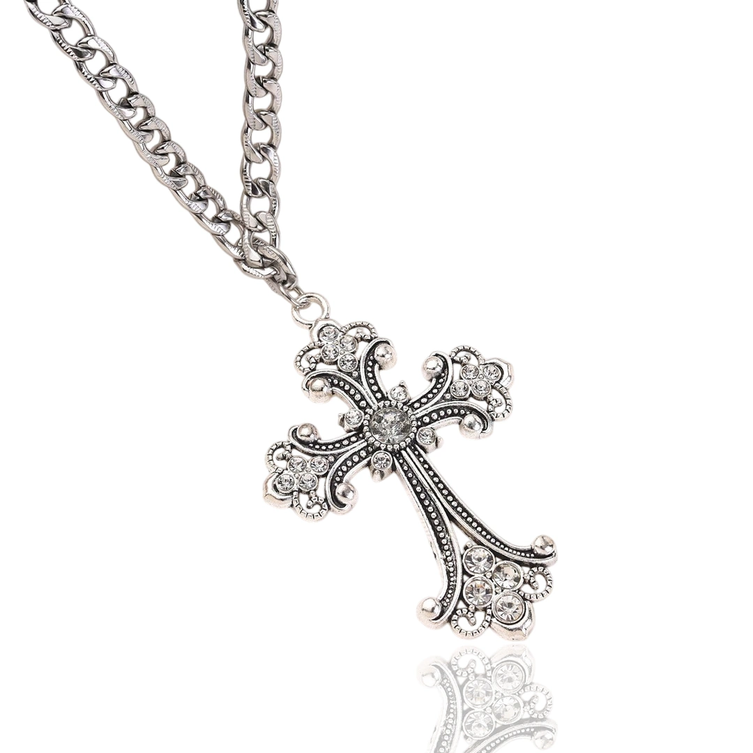 Au centre, le pendentif attire tous les regards : une croix gothique stylisée, richement détaillée, presque baroque dans ses formes. Chaque courbe et chaque relief sont mis en valeur par une constellation de zircons cubiques étincelants, captant la lumière pour révéler un éclat contrastant, entre ombre et brillance.