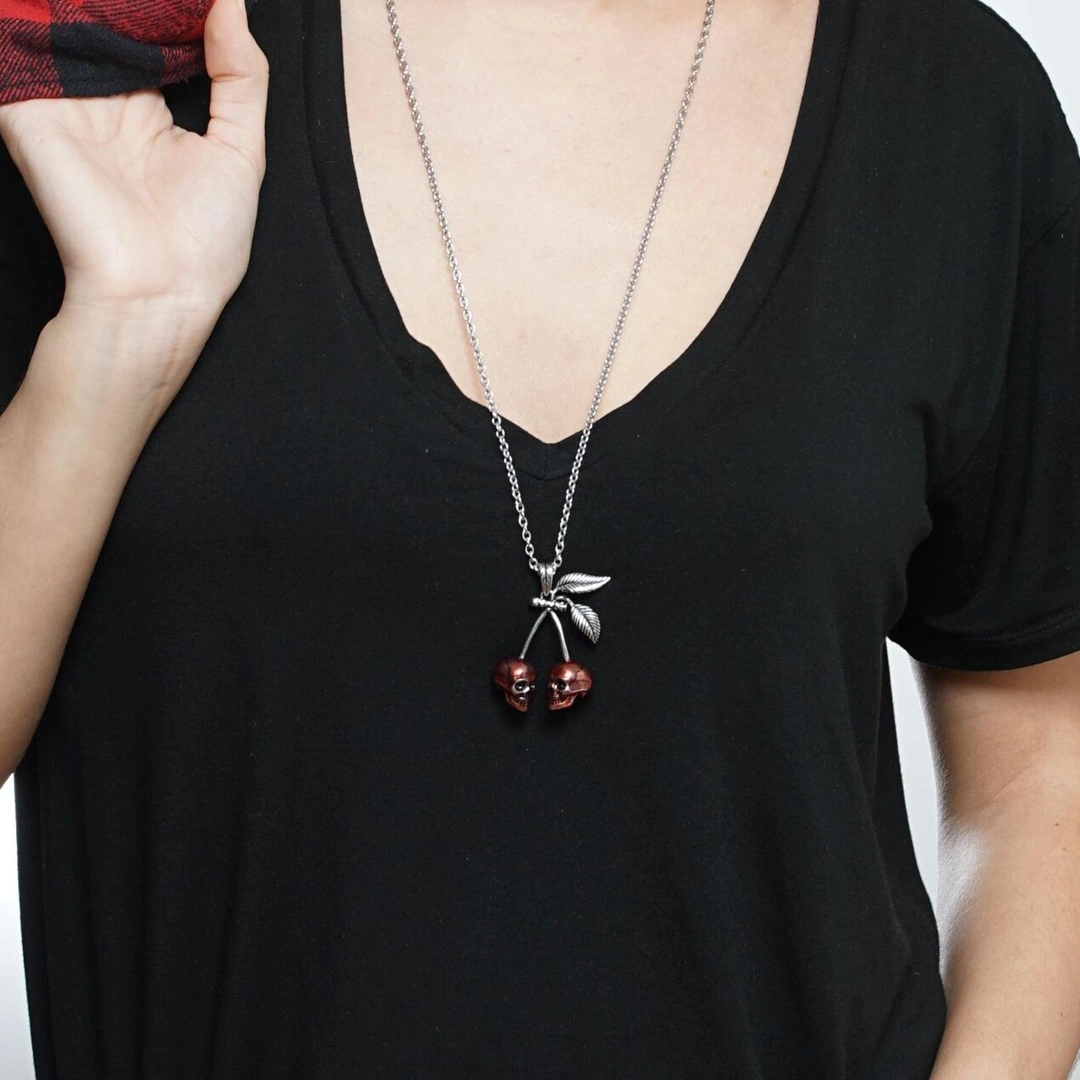 Deux cerises crâniennes brillent d’un rouge sanglant : un bijou pour les âmes sucrées au goût de rébellion. Chaîne 60 cm.