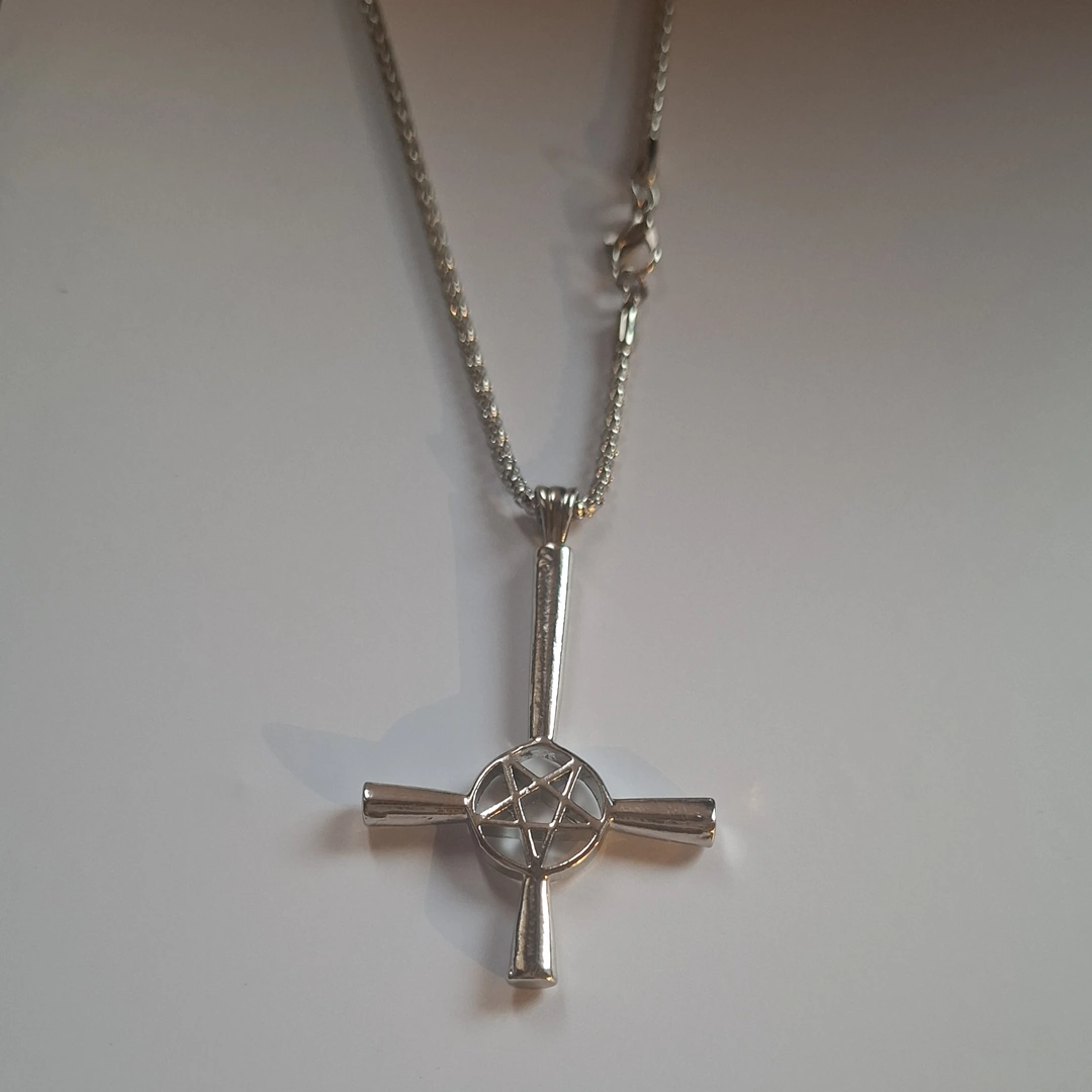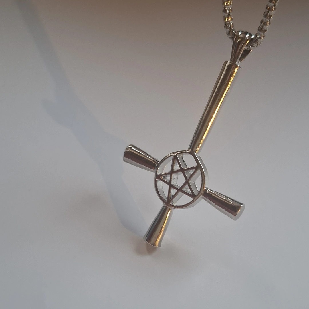 Pendentif croix inversée & pentacle pointé vers le bas. Acier inoxydable, chaîne 60 cm. Bijou ésotérique, rebelle et protecteur.