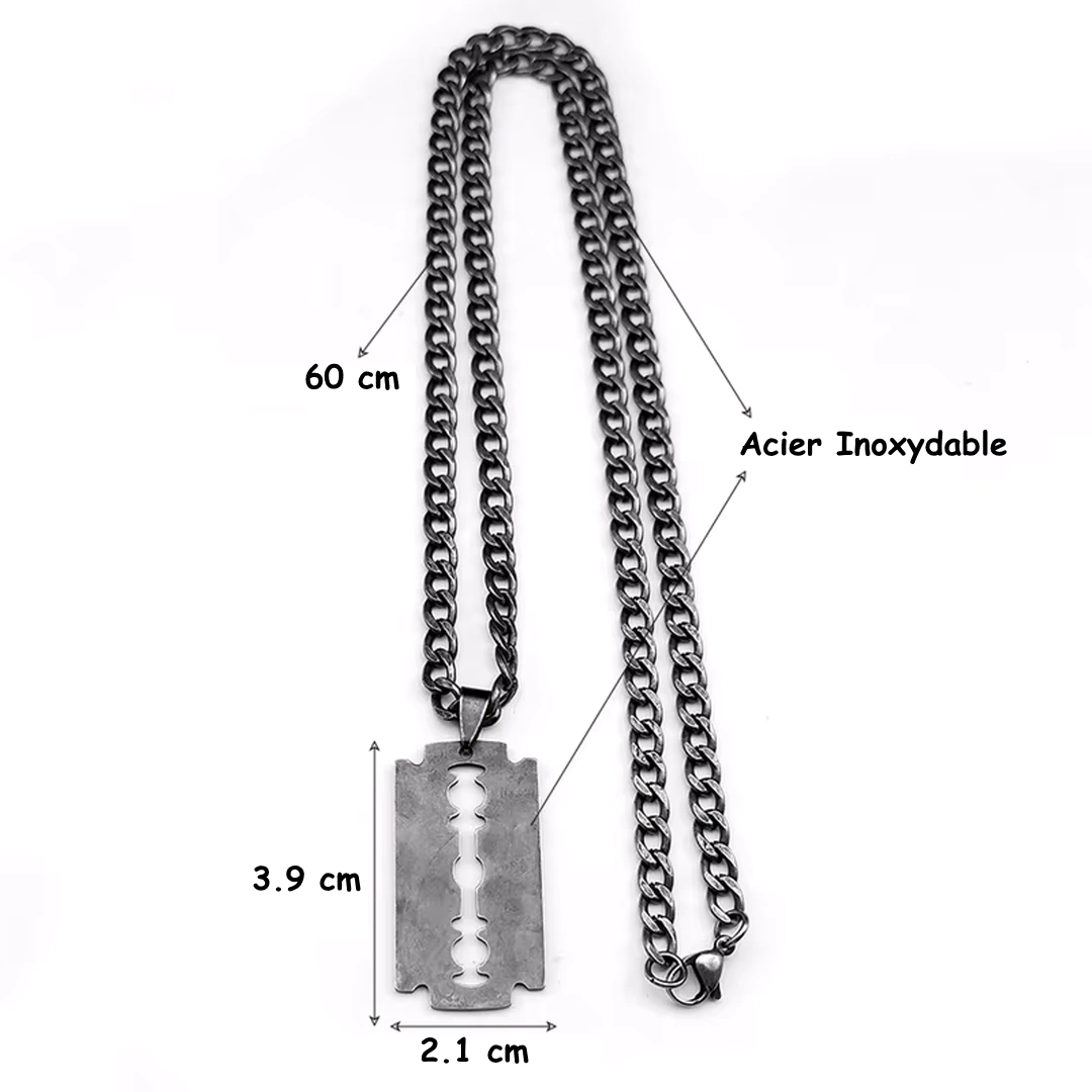 Affirmez votre style avec ce collier lame de rasoir en acier aux reflets patinés. Un bijou gothique & punk audacieux, symbole de liberté et de caractère brut.