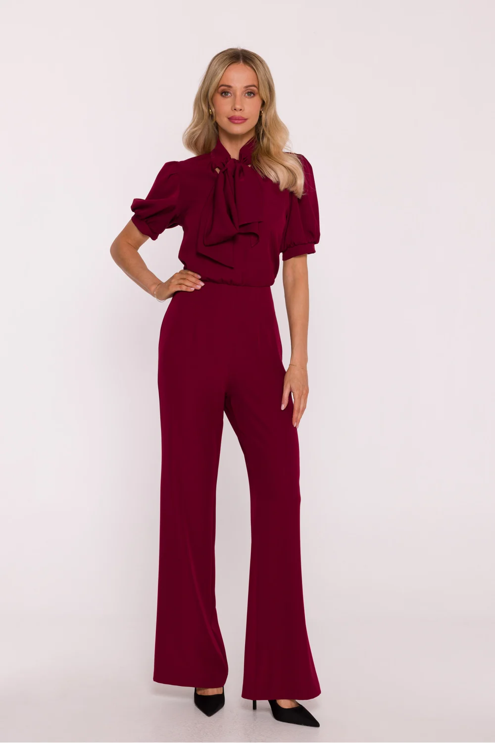 Un élégant tailleur pour femme est une alternative élégante à la robe, un choix idéal pour des occasions spéciales et des sorties élégantes. Fabriqué dans un tissu lisse légèrement brillant, il présente une allure très chic tout en garantissant un grand confort. Le modèle se distingue par son décolleté féminin en forme de V, associé à un col montant se transformant en un joli nœud qui ajoute une touche de délicatesse à l’ensemble. Les manches courtes bouffantes se terminent par des poignets avec de légères fronces, donnant à la silhouette légèreté et un caractère romantique. Le haut a une coupe légèrement blousante, tandis que la taille haute souligne joliment la silhouette et allonge visuellement les jambes. Les jambes sont longues, larges et légèrement évasées vers le bas, donnant à la silhouette des proportions élégantes et assurant une grande liberté de mouvement. Le tout est complété par une fermeture éclair dissimulée à l’arrière, garantissant un ajustement parfait. Conçu et fabriqué en Pologne avec une attention particulière aux détails et à la plus haute qualité de finition.