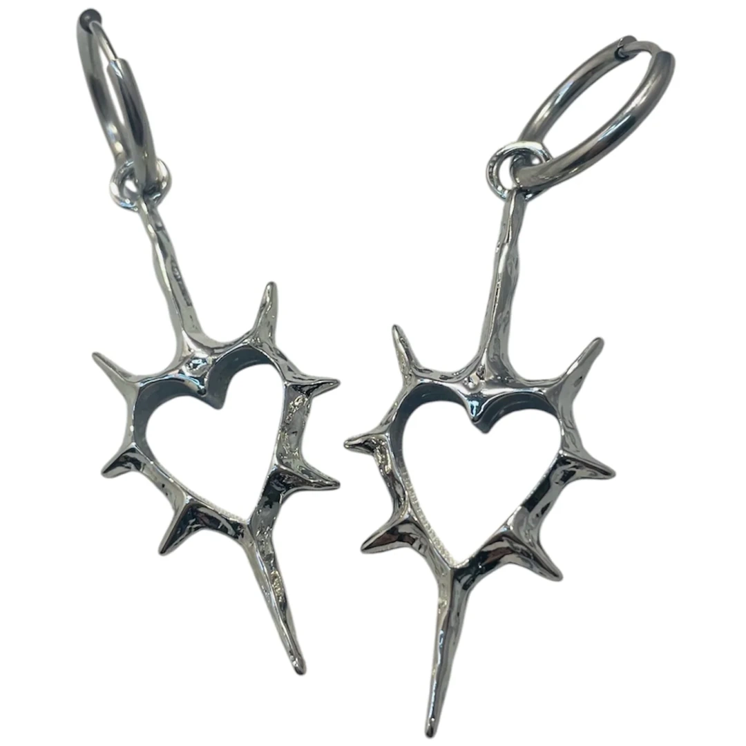 Ces créoles en acier 316L dévoilent un motif singulier : un cœur ajouré, entouré d’épines métalliques étirées, presque organiques. La forme évoque autant la passion que la défense, comme si l’émotion se construisait autour d’une armure.