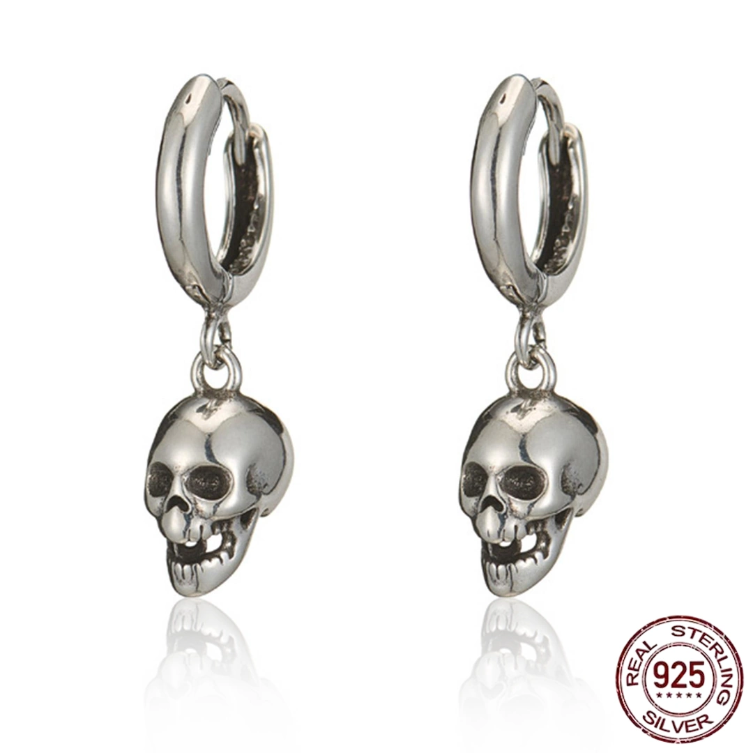 Créoles argent 925 à tête de mort suspendue. Anneau 10 mm, crâne mobile 7 × 5 mm. Style gothique fin, lumineux et expressif au quotidien.