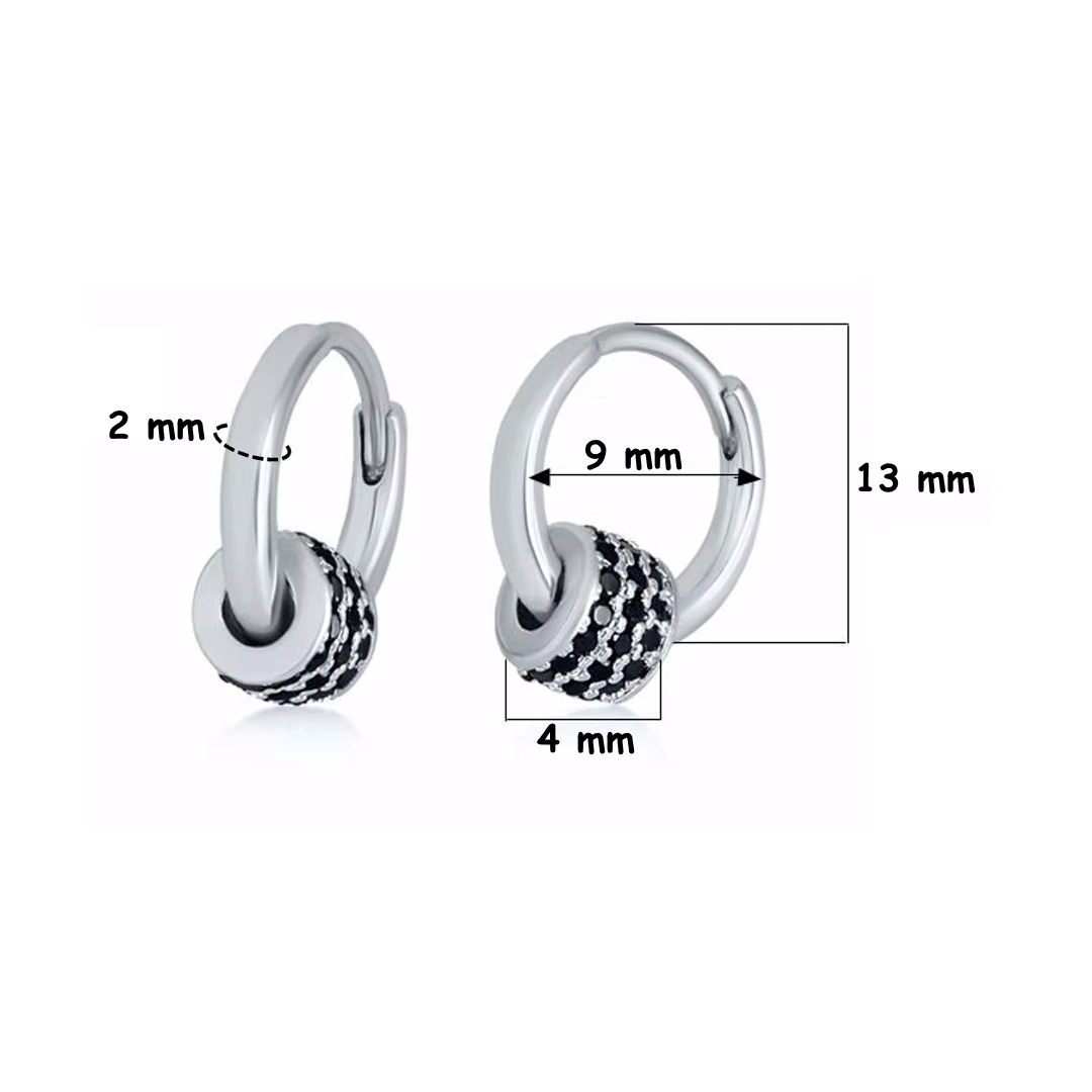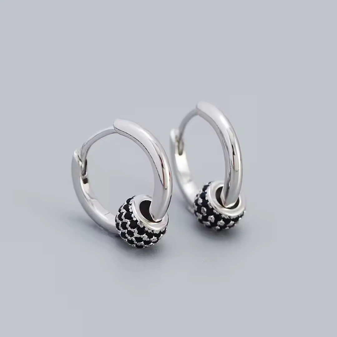 Ces créoles en argent 925 associent la pureté d’un anneau lisse à la présence d’un cylindre pavé de zircons noirs. Une opposition maîtrisée entre volume, texture et lumière.