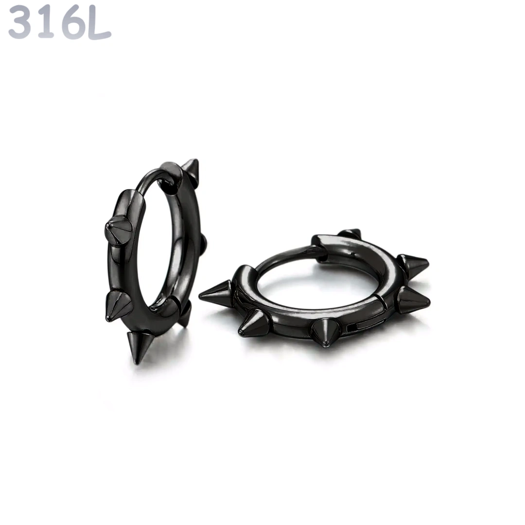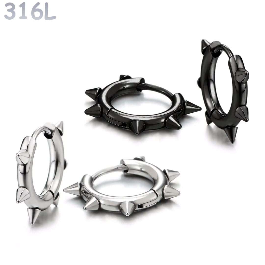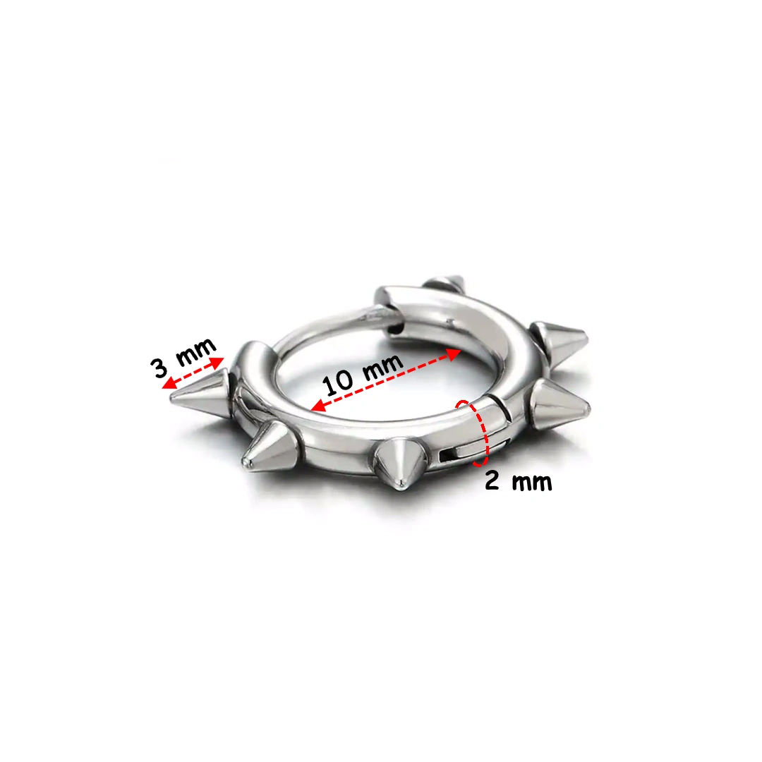 Ces créoles en acier 316L reprennent un symbole fort de l’esthétique alternative : l’anneau classique transformé par une série de pointes acérées, réparties sur toute sa circonférence.
