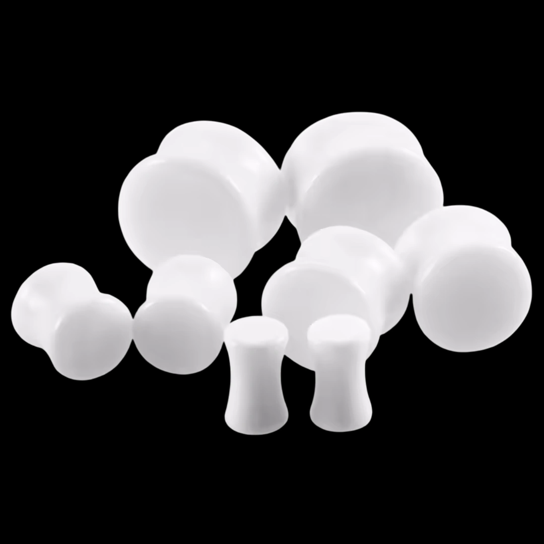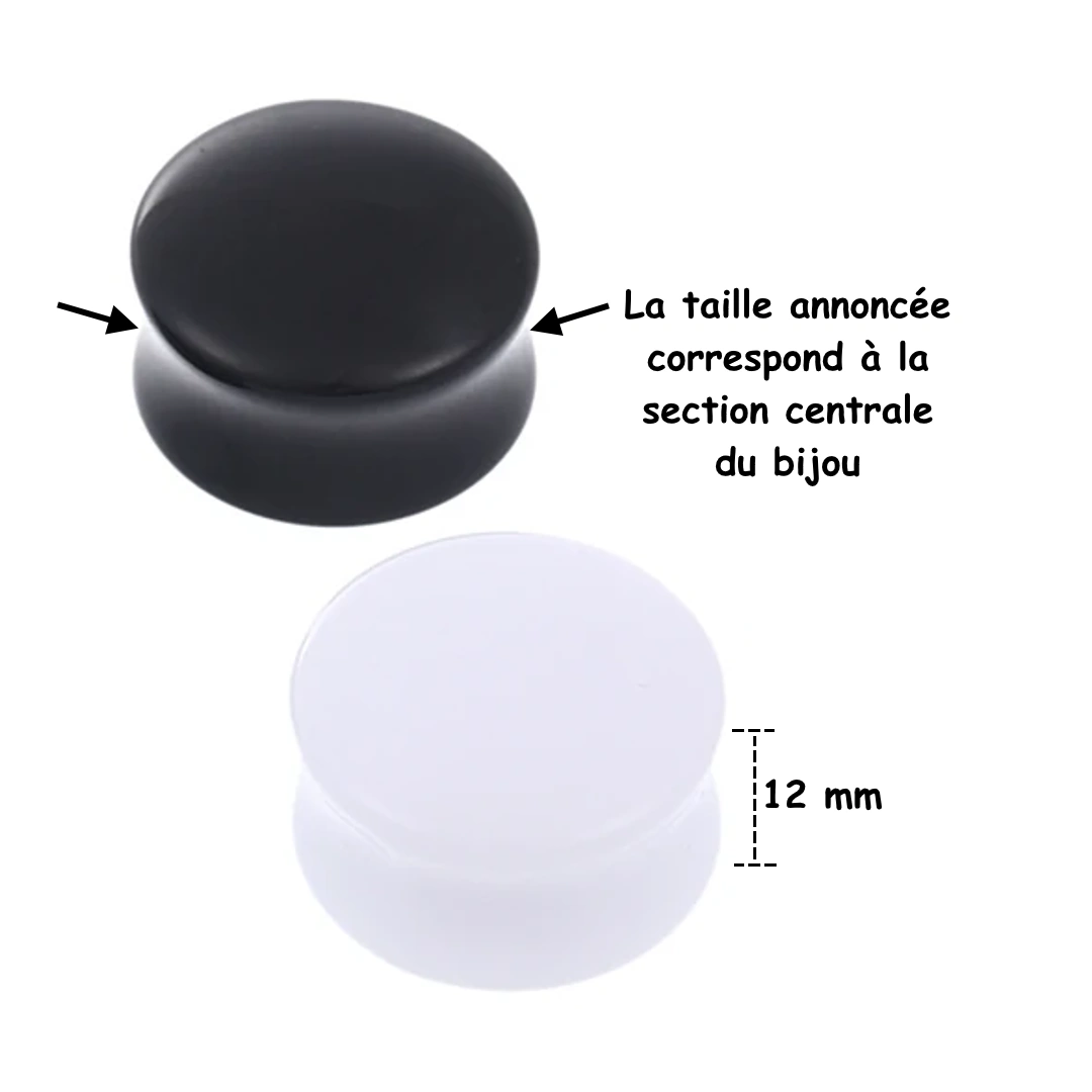 Plug d’oreille en acrylique couleur blanc ou noir, double évasé, léger et confortable. Disponible du 3 au 30 mm. Écarteur vendu à l’unité.