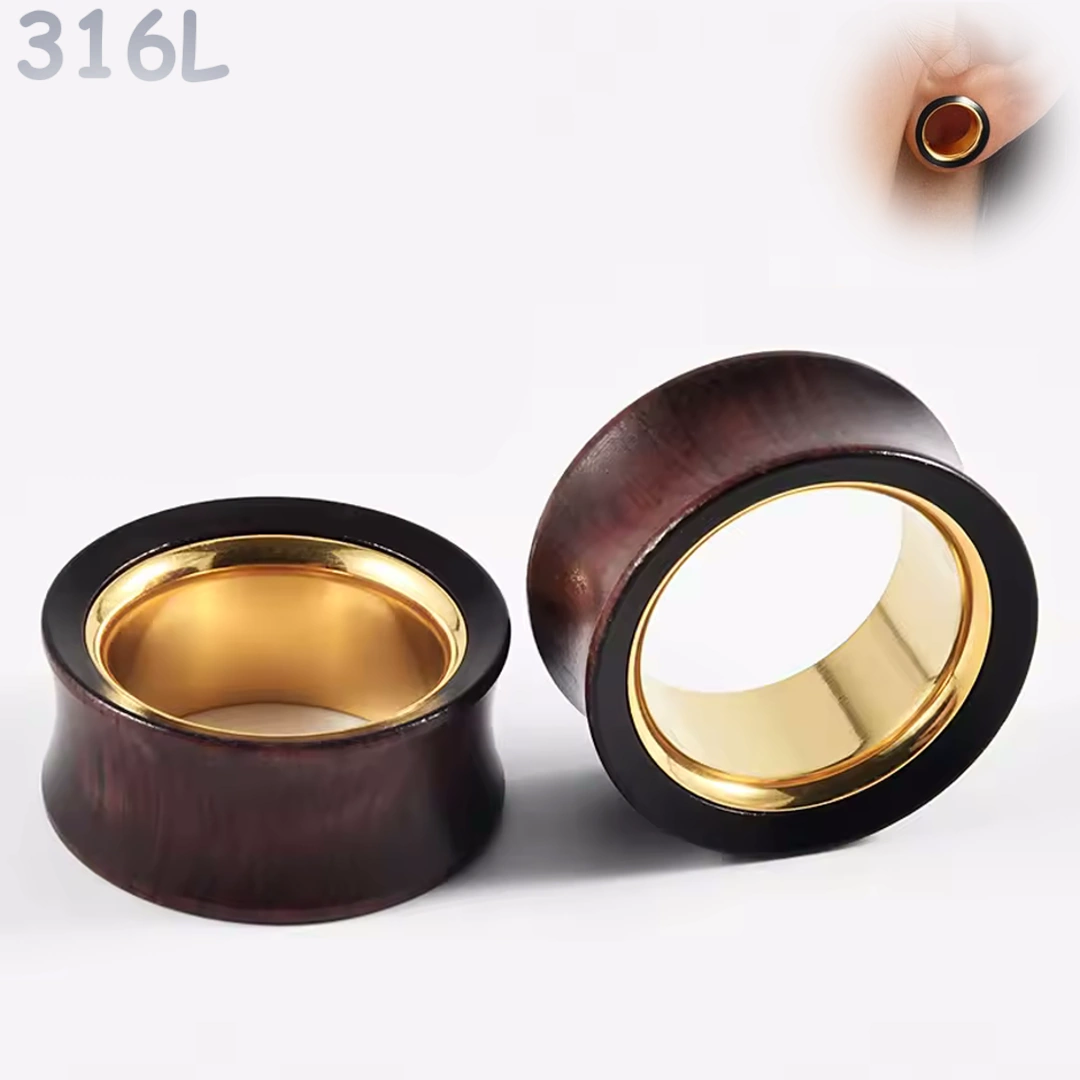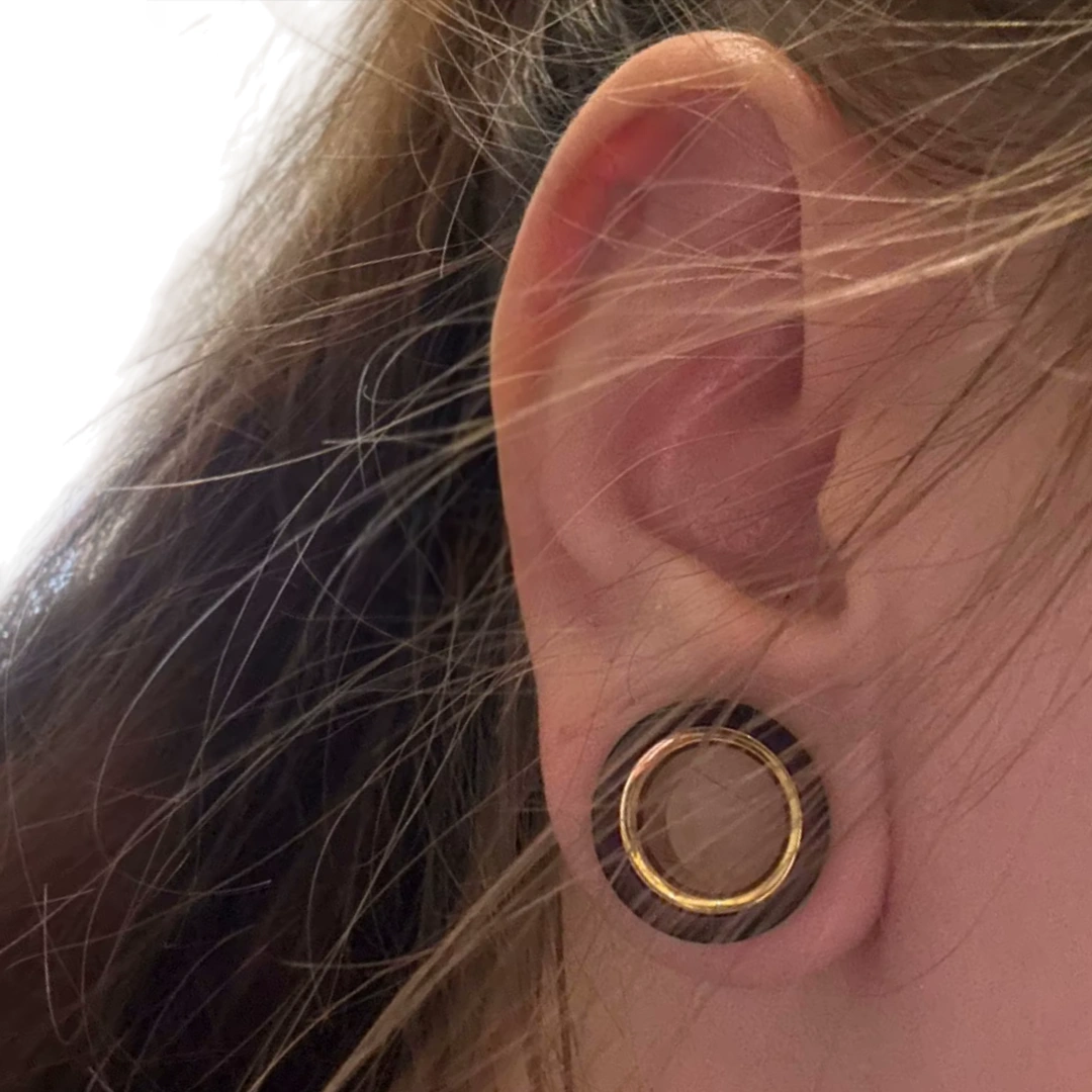 Ce tunnel d’oreille en bois de santal, décliné du 8 au 25 mm, séduit par son design double évasé et son contraste unique : un intérieur en acier chirurgical 316L, finition dorée par ionisation, lumineux et élégant.