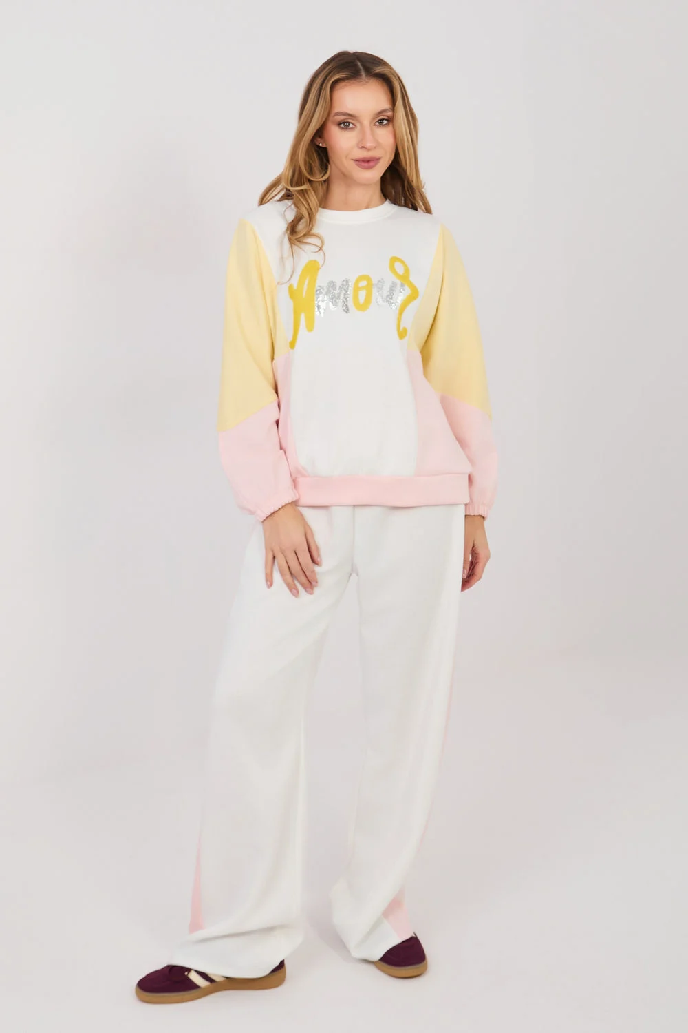 Ensemble de survêtement pour femme exceptionnellement confortable fabriqué dans un matériau type beurre incroyablement doux, délicat et agréable au toucher. Le tissu, composé de polyester, de viscose et d’élasthanne, est élastique, légèrement fluide et s’ajuste parfaitement à la silhouette, offrant un confort maximal dans une utilisation quotidienne. L’ensemble se compose d’un sweat à manches longues et d’un pantalon à larges jambes longues. Le sweat avec un col rond classique est orné d’un motif élégant avec des paillettes, qui donne à l’ensemble un caractère à la mode et féminin. Le pantalon taille haute souligne joliment la taille et assure un confort de port. À la taille, il y a des cordons de serrage permettant un ajustement parfait à la silhouette. Les poches latérales pratiques augmentent la fonctionnalité, tandis que les larges jambes donnent à la tenue un look décontracté et moderne. C’est l’ensemble parfait pour les femmes qui apprécient l’alliance d’une douceur exceptionnelle, de confort et de détails à la mode dans leurs tenues quotidiennes.