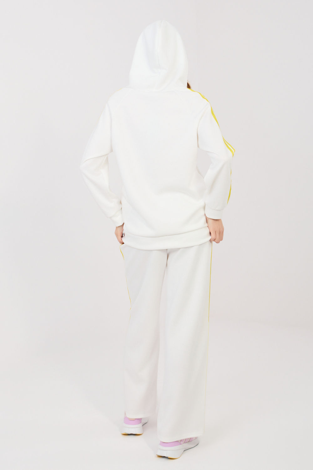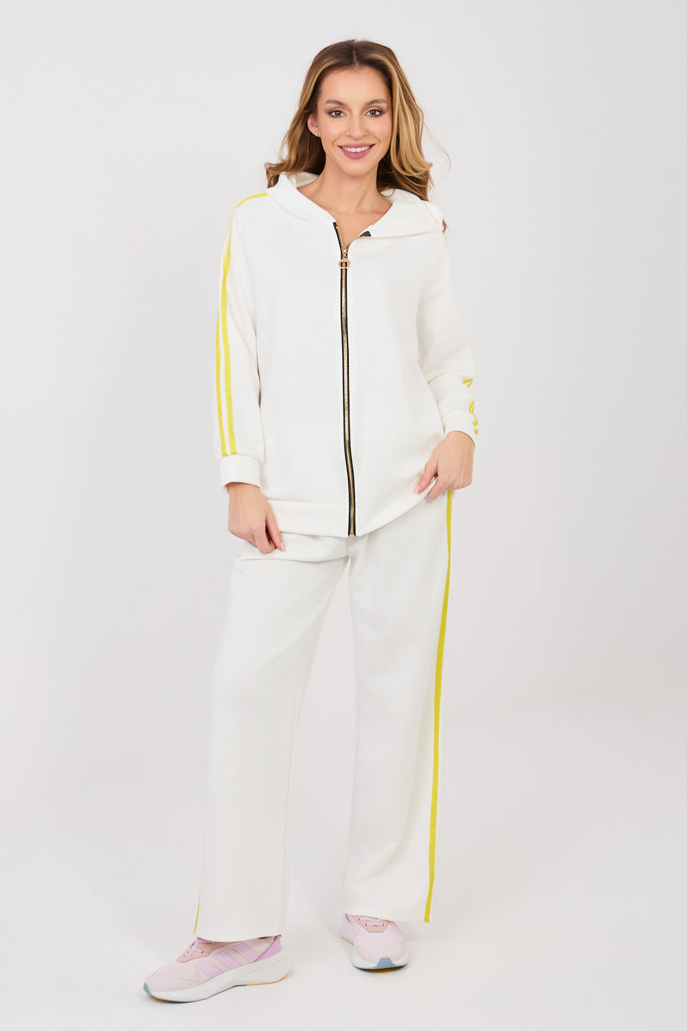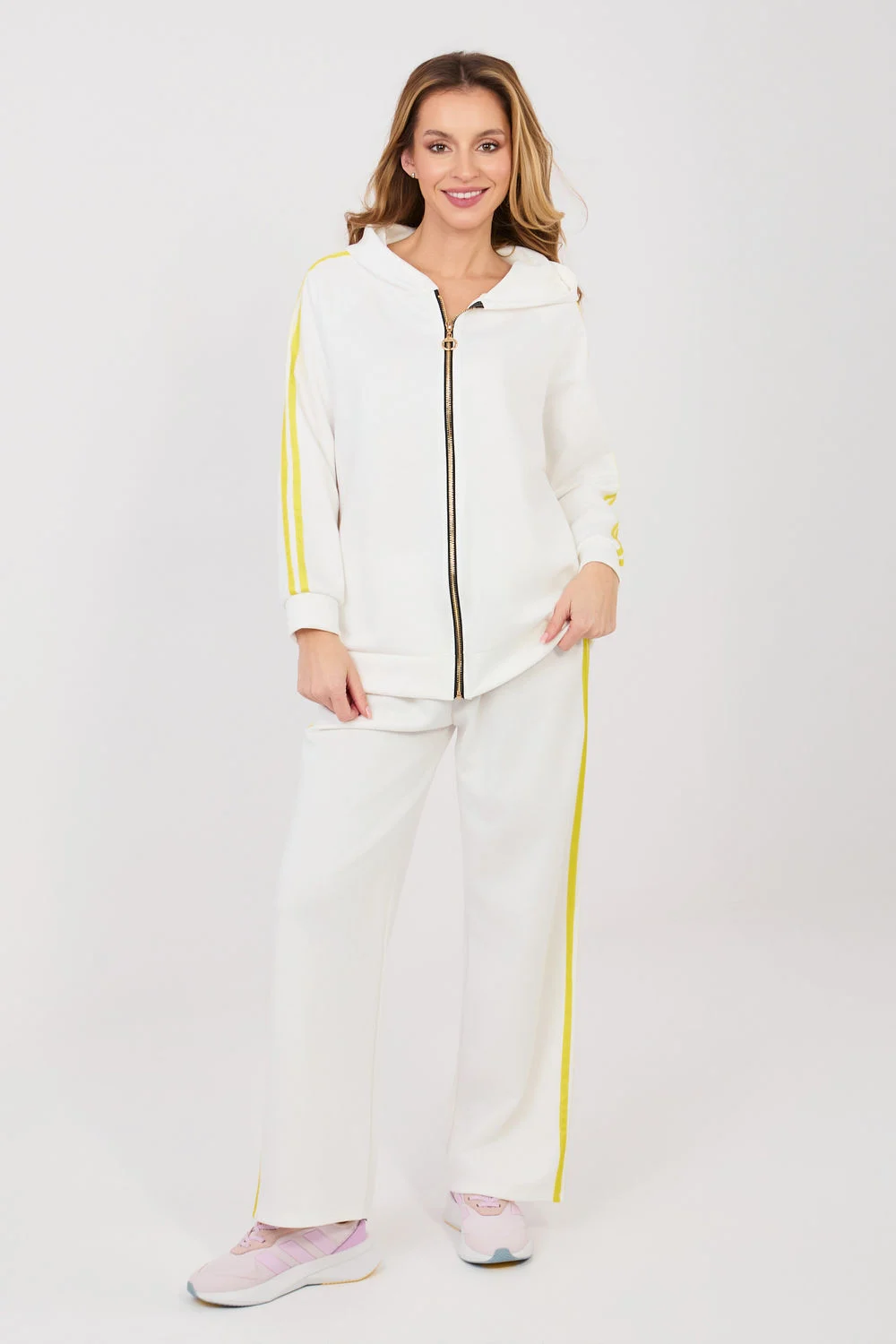 Ensemble de survêtement pour femmes composé d’un sweat à capuche et d’un pantalon, idéal pour les tenues décontractées au quotidien. Le motif lisse donne au set un aspect moderne et polyvalent, parfait pour une promenade, faire des courses ou se détendre. L’ensemble est fabriqué dans un mélange de polyester, d’élasthanne et de viscose confortable et agréable à porter. Le matériau est doux, élastique et s’adapte bien à la silhouette, offrant un confort toute la journée. Le sweat à capuche à manches longues a une capuche pratique et une fermeture éclair, facilitant l’enfilage et permettant de l’adapter à la météo. Les poches latérales enfoncées sont un autre atout. Les manches sont ornées de bandes à la mode qui ajoutent un caractère sportif. Le pantalon a une taille haute et des jambes longues et larges qui offrent une liberté de mouvement. La taille élastique et le cordon permettent un ajustement optimal. Les bandes sur les jambes soulignent le style moderne et décontracté-sportif de l’ensemble.