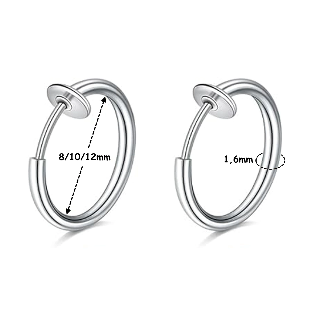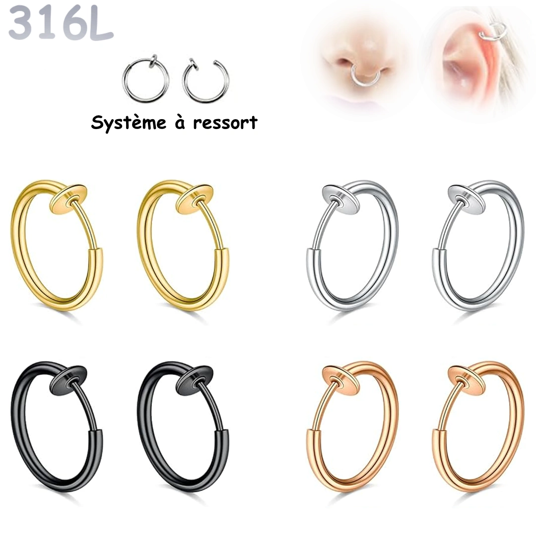 Faux piercing anneau à ressort en acier 316L. Pour nez ou oreille. Épaisseur 1,6 mm, effet réaliste garanti. Disponible en argenté, doré, noir ou or rose. Vendu par paire.