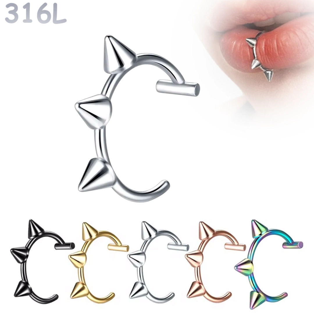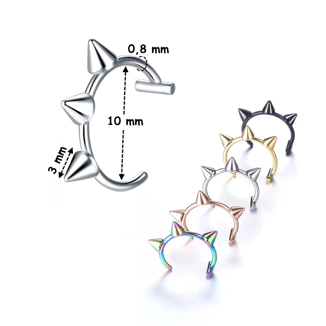 Faux piercing lèvre à pointes en acier chirurgical 316L. Anneau 10 mm, tige fine 0,8 mm et barre d’arrêt stabilisante. Style punk sans perçage.