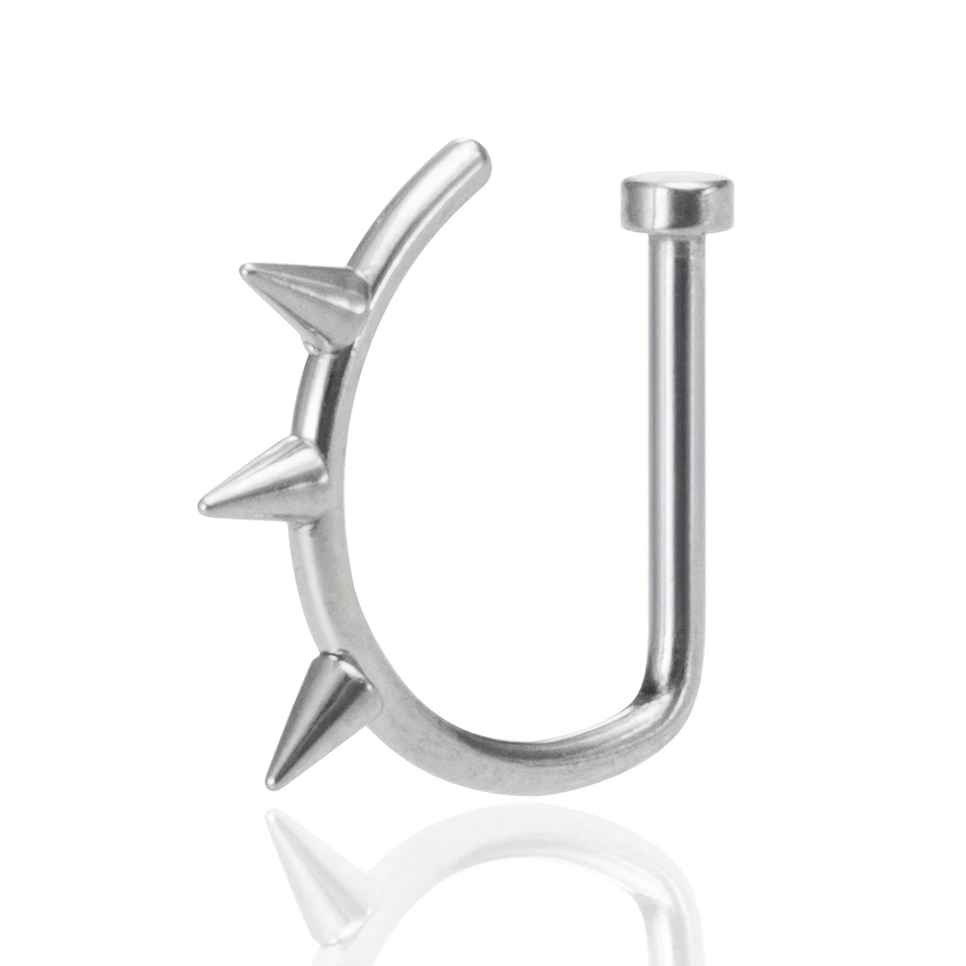 Faux piercing narine en acier inoxydable, demi-anneau forme de D ponctué de trois pointes fines. Sans perçage, pour un look affirmé.
