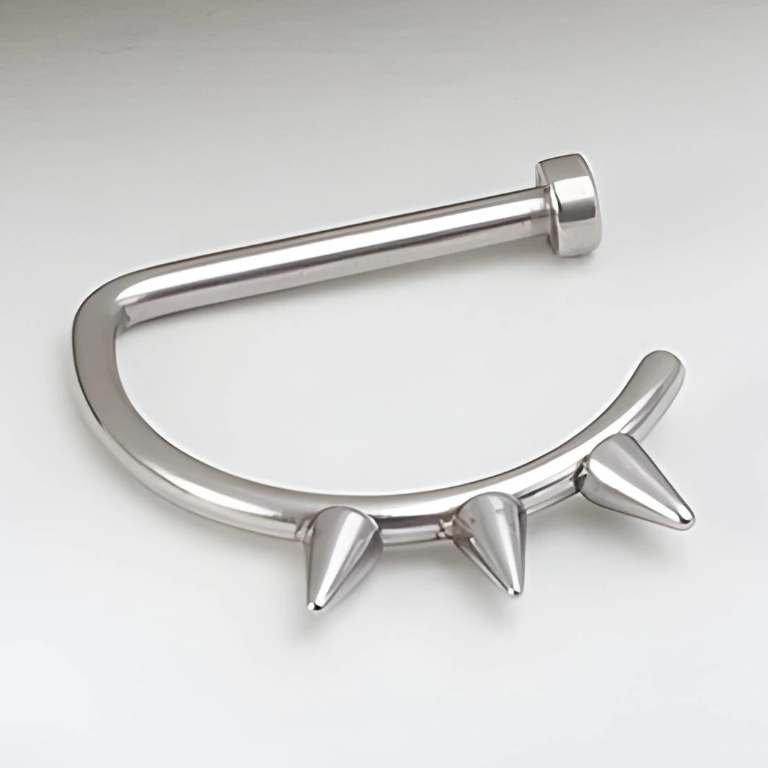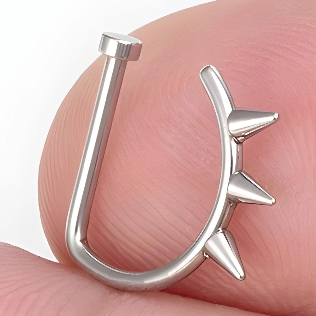 Conçu en acier inoxydable, il prend la forme d’un demi-anneau ouvert en D, pensé pour épouser naturellement le bord de la narine et rester bien en place. Sa partie visible est soulignée par trois pointes discrètes de 2 mm, comme autant de petits éclats d’attitude.