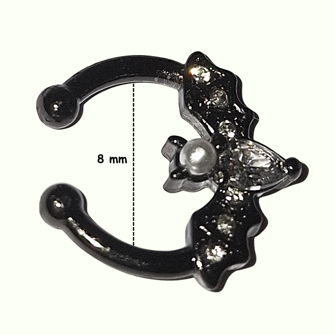 Faux septum à clip chauve-souris en acier noir, orné de strass et perle nacrée. Mystique, scintillant, et sans perçage. Diamètre interne 8 mm.