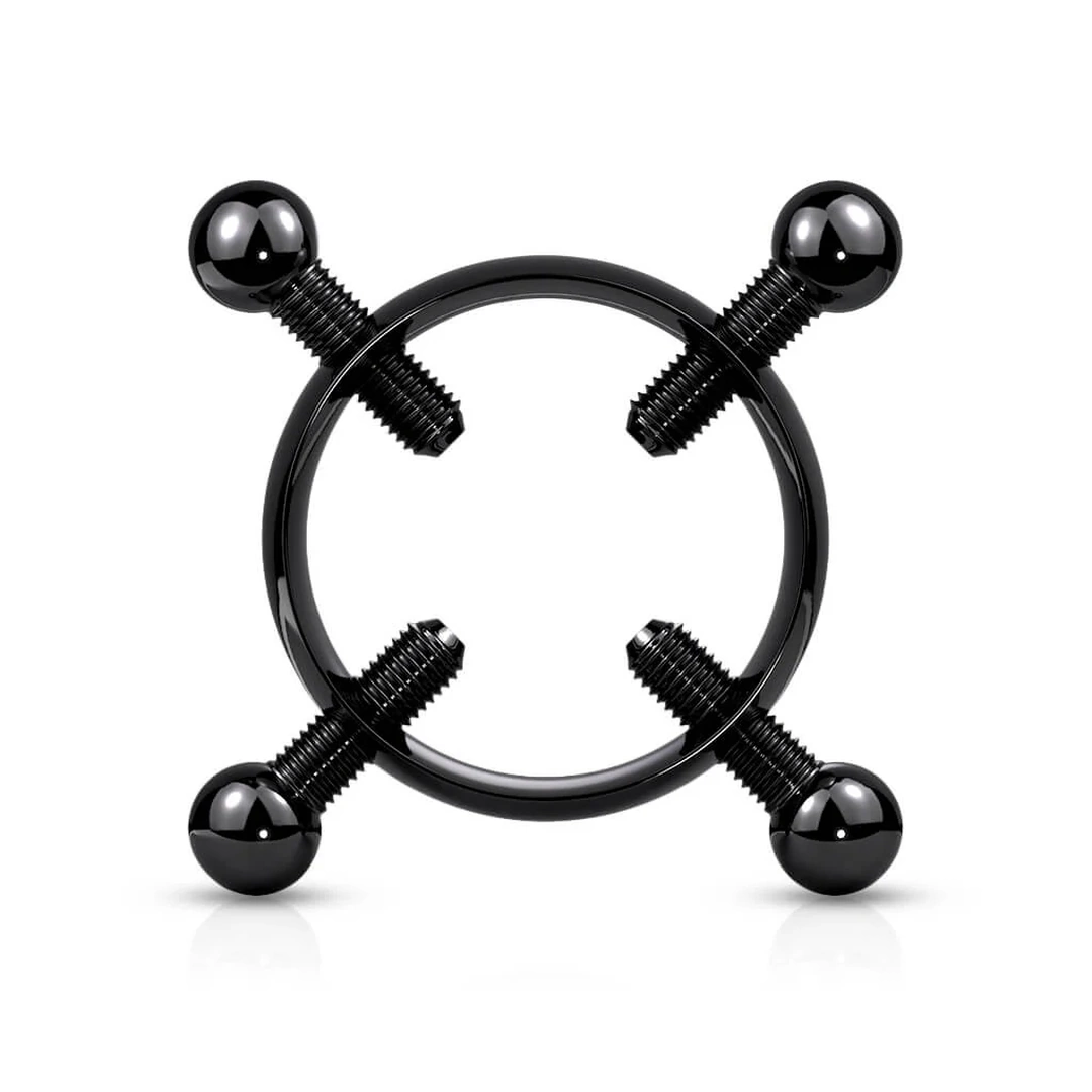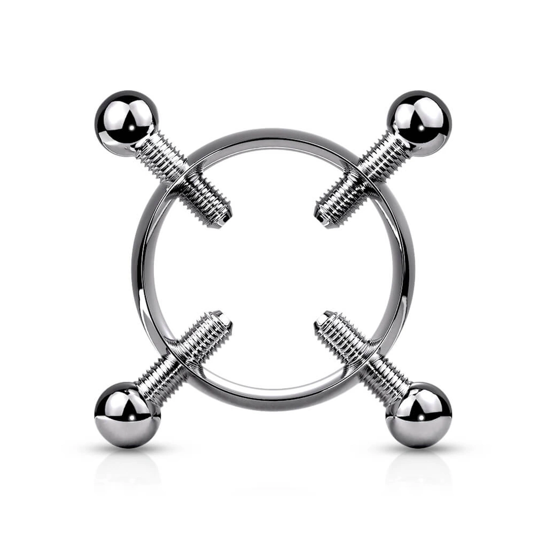 Faux piercing téton en acier chirurgical 316L avec 4 vis de serrage et billes de 5 mm. Léger, ajustable, sans perçage. Disponible en 3 teintes intenses. Vendu à l’unité.