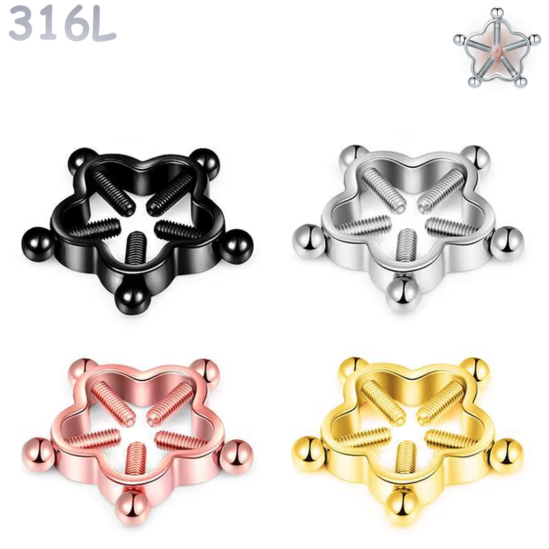 Faux piercing téton fleur industrielle avec 5 vis de serrage. Couleur acier brut, anodisé noir, or rose ou doré (PVD). Unisexe, sensuel et ajustable. Vendu à l’unité.
