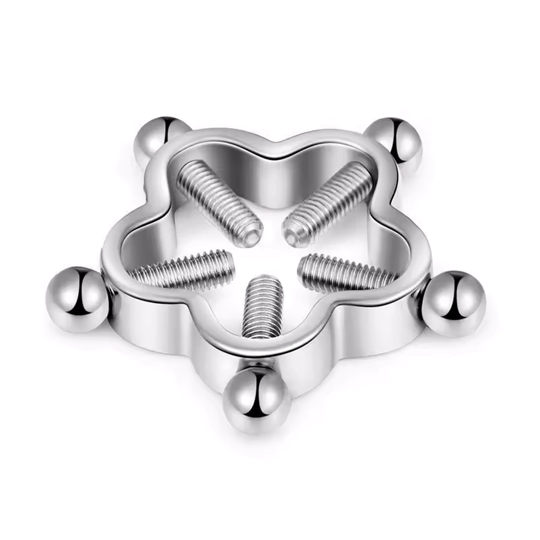 Cinq vis de serrage, chacune ponctuée d’une bille de 5 mm, permettent un ajustement précis au mamelon, sans douleur ni perforation. La fleur épouse la peau comme une parure sauvage, sensuelle et assumée.