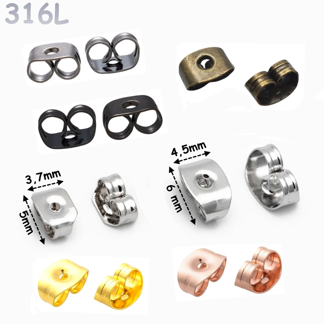 Fermoirs papillon (poussette) pour boucles d’oreilles en acier 316L, vendus par paire. Tailles standard ou large, maintien fiable, 6 finitions au choix.