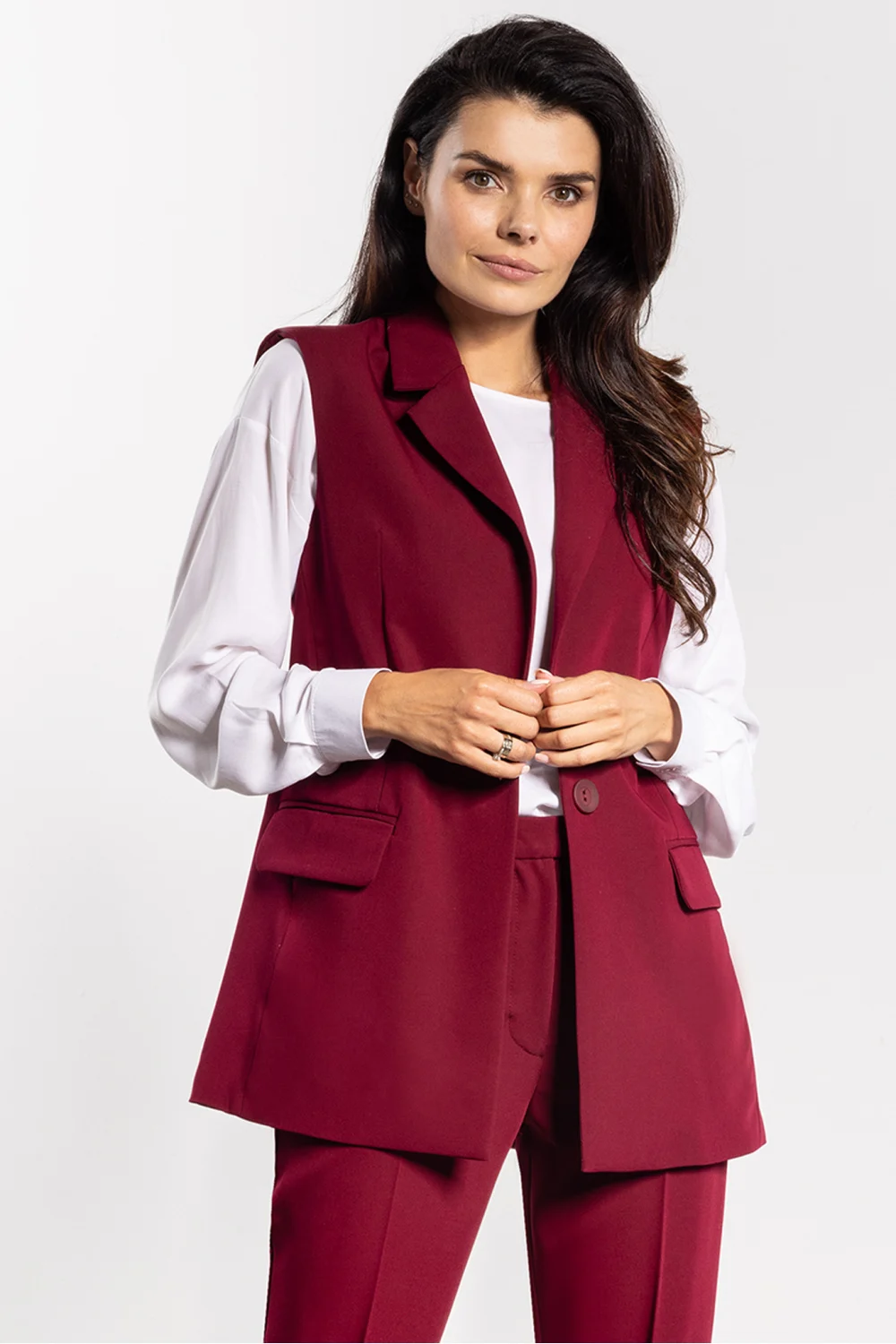 Un gilet élégant de coupe simple et classique est un élément intemporel de la garde-robe. La fermeture à un bouton et les revers au décolleté soulignent le caractère élégant, tandis que la ligne légèrement allongée affine la silhouette. Les poches pratiques à rabat ajoutent une touche moderne, et la coupe polyvalente permet d’associer le gilet avec des pantalons, des cigarettes et des jupes. Idéal pour des tenues professionnelles et décontractées.