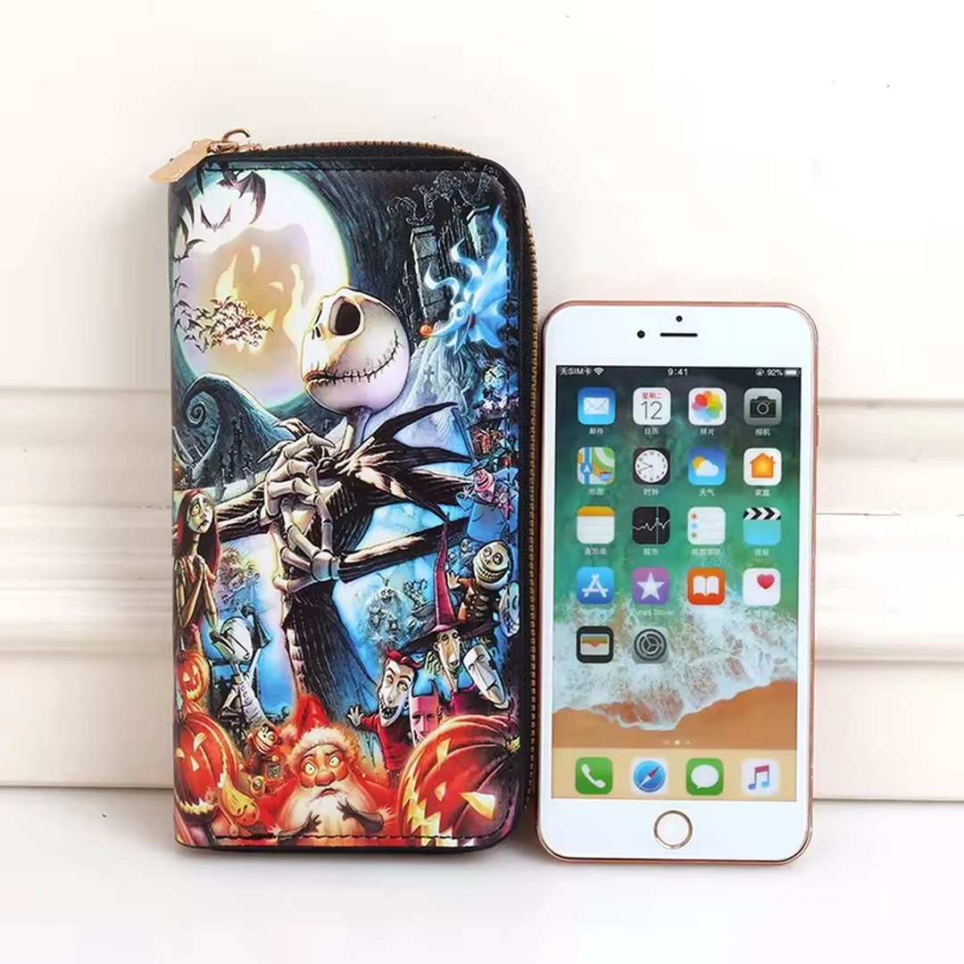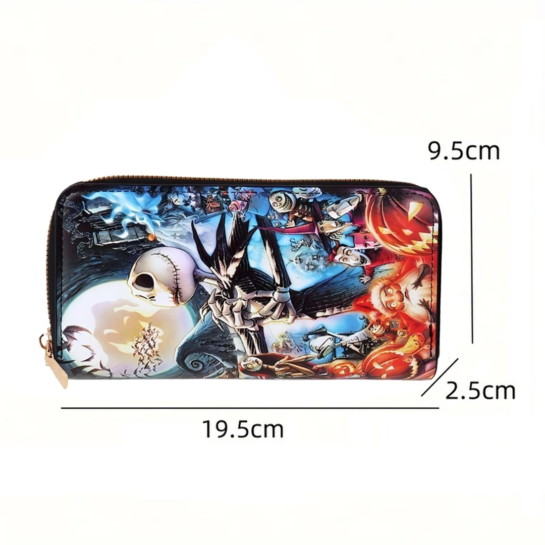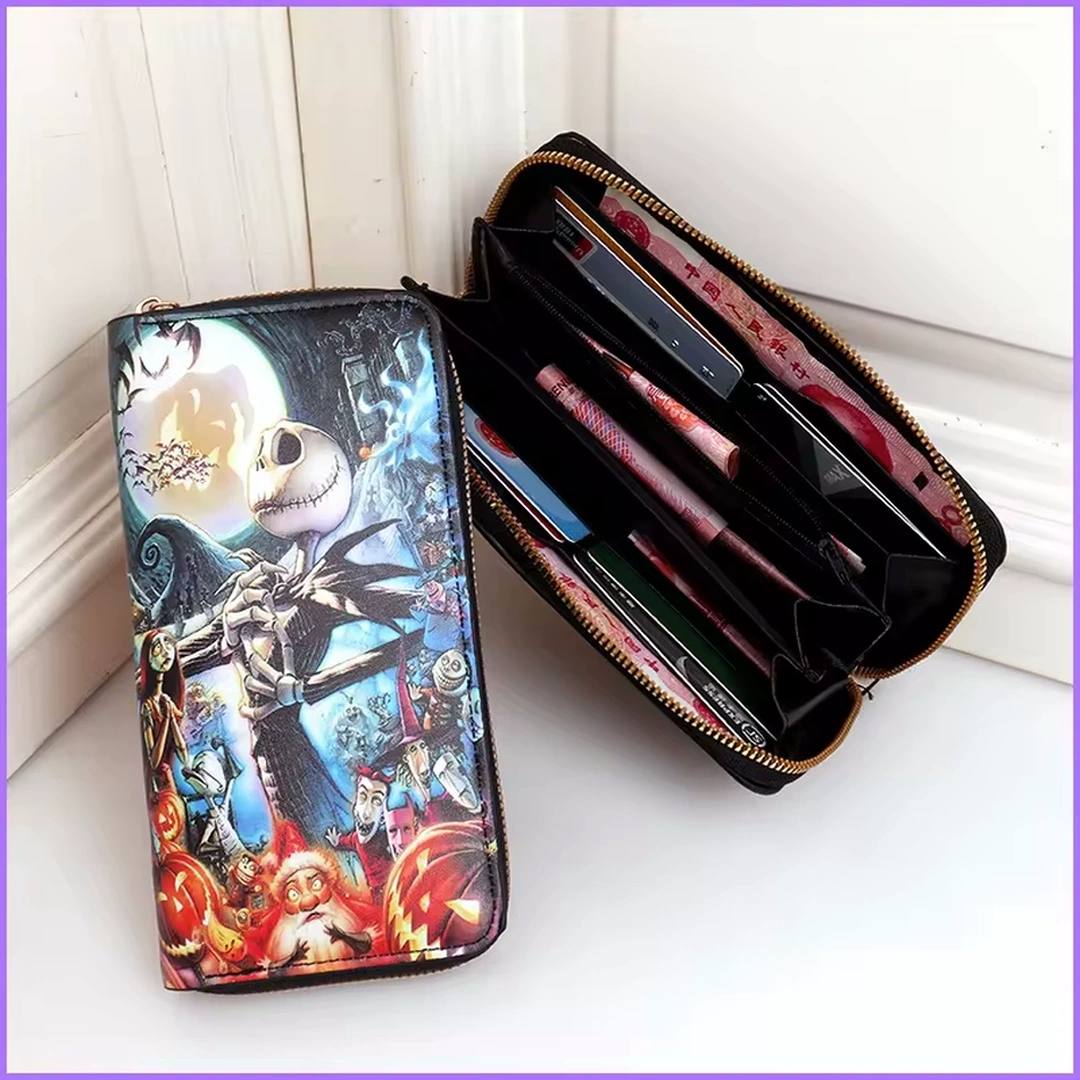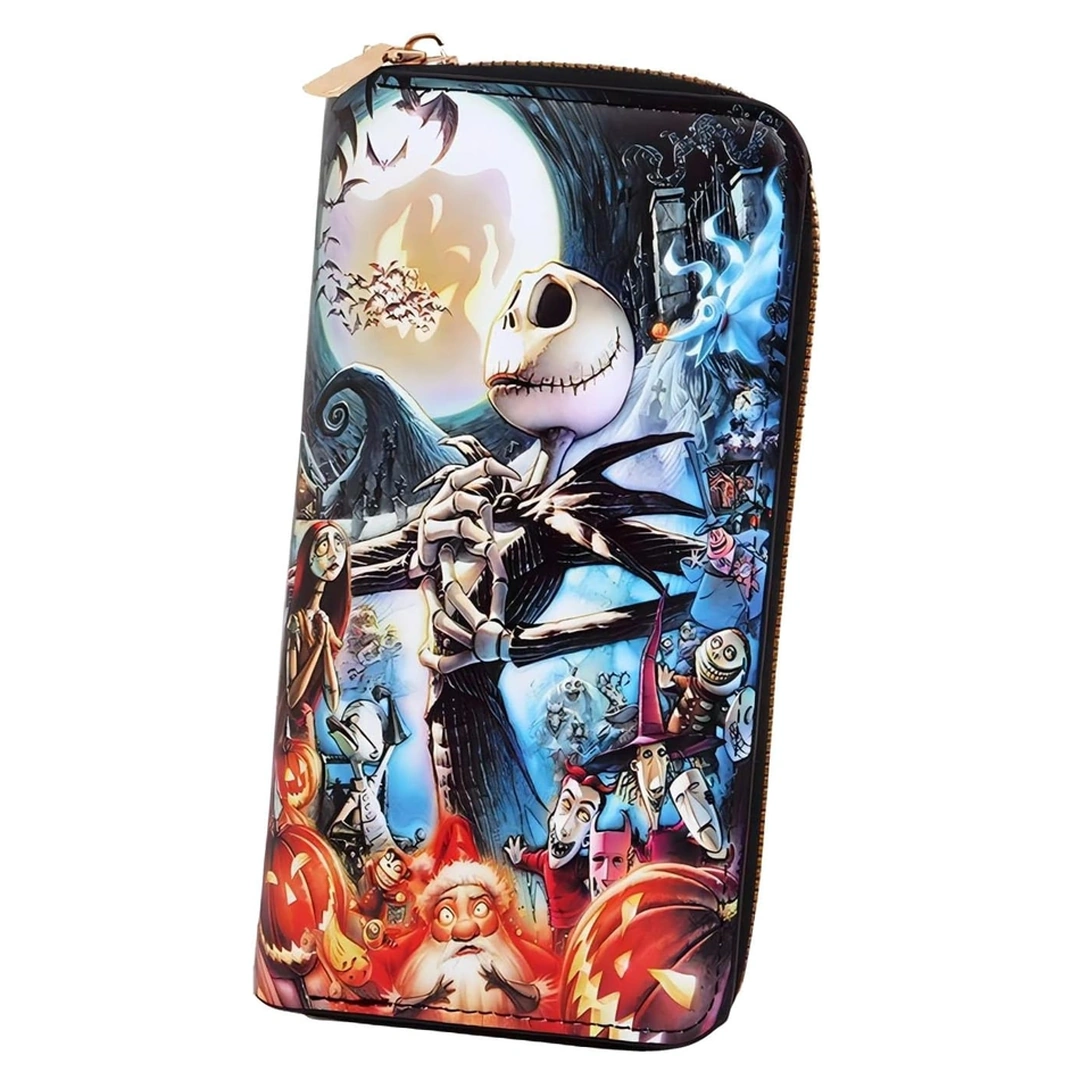 Grand portefeuille en cuir PU inspiré de L’Étrange Noël de Monsieur Jack, sublimé par une illustration emblématique de Jack Skellington. Élégant et fonctionnel, il dispose de multiples compartiments, dont une poche zippée pour la monnaie.